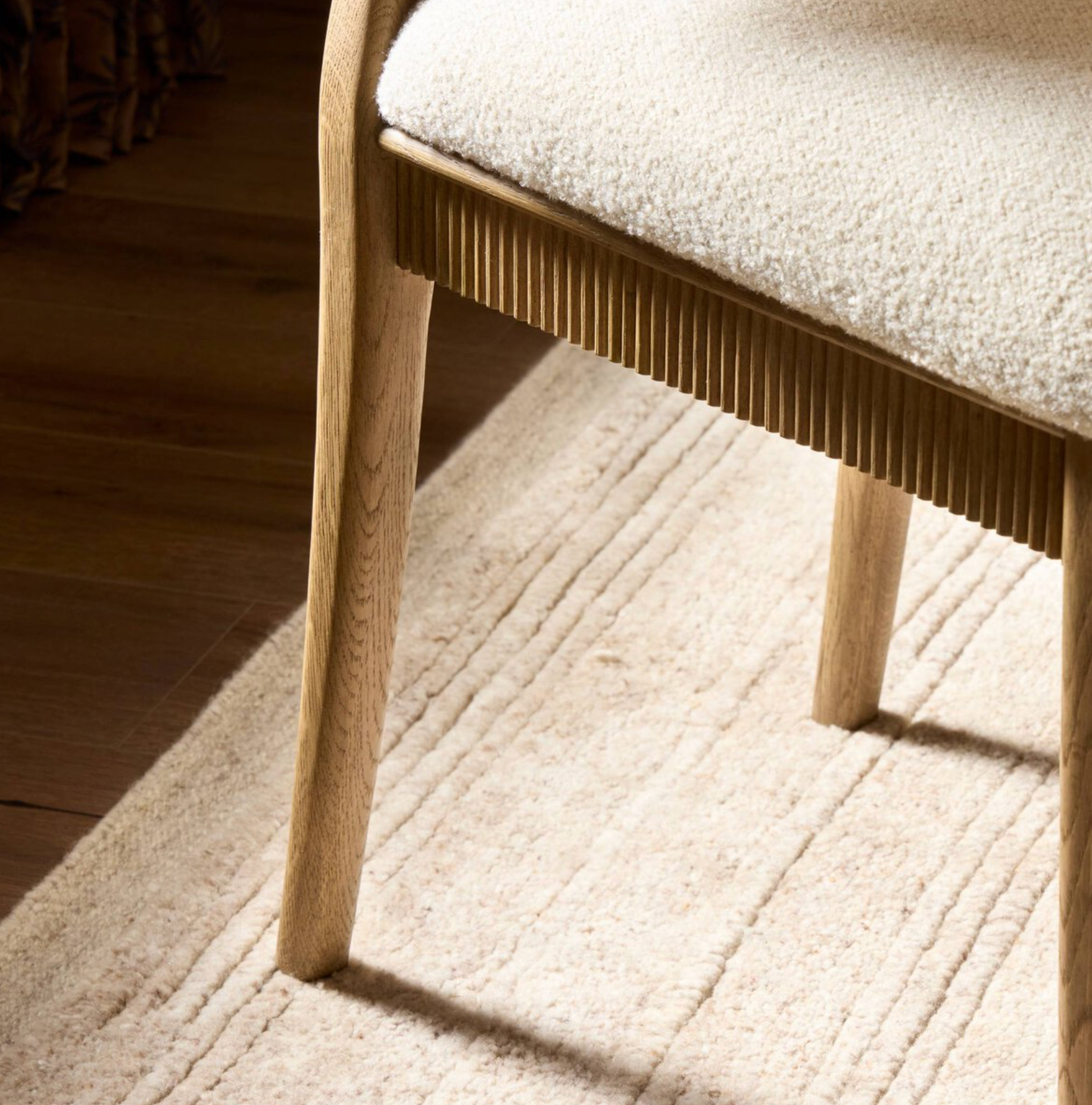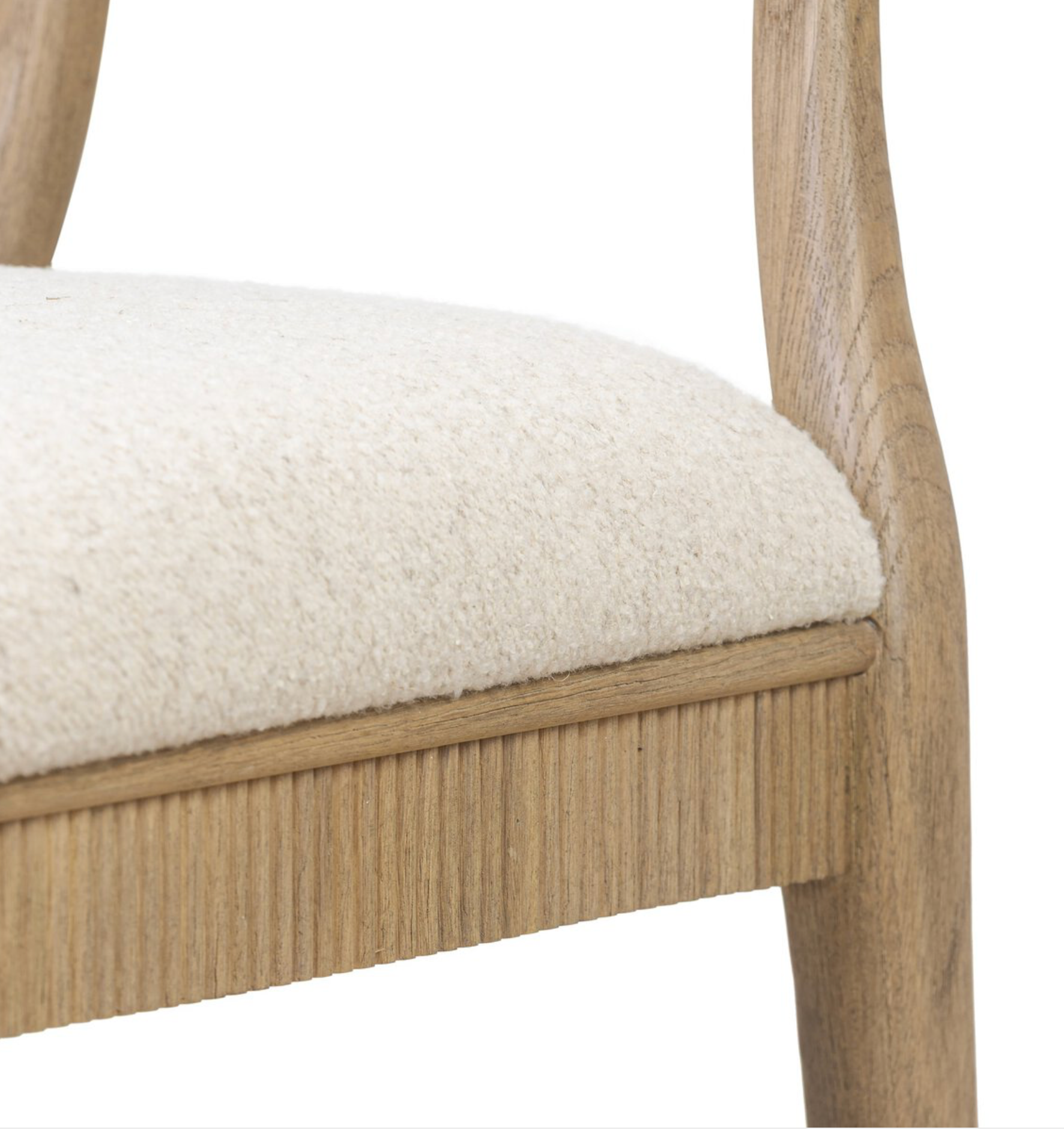 Baroque details give a classical vibe to this drifted oak chair with its tapered seat back and reeded apron. Curved back legs connect to the cylindrical-shaped cushion in oatmeal-hued upholstery. Performance fabrics are specially created to withstand spills, stains, high traffic and wear, ensuring long-term comfort and unmatched durability.