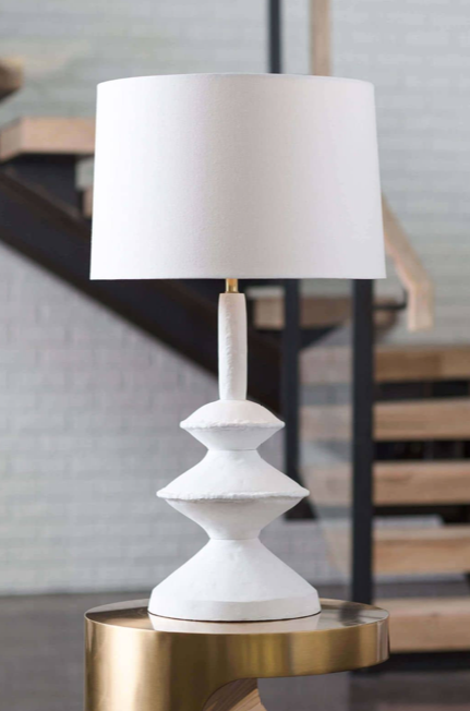 Inspired by a paper maché sculpture, this versatile lamp is at home in a variety of spaces. Complex curves, paired with a matte white finish gives this table lamp a unique appearance. Slight imperfections were left in, adding beauty and originality.