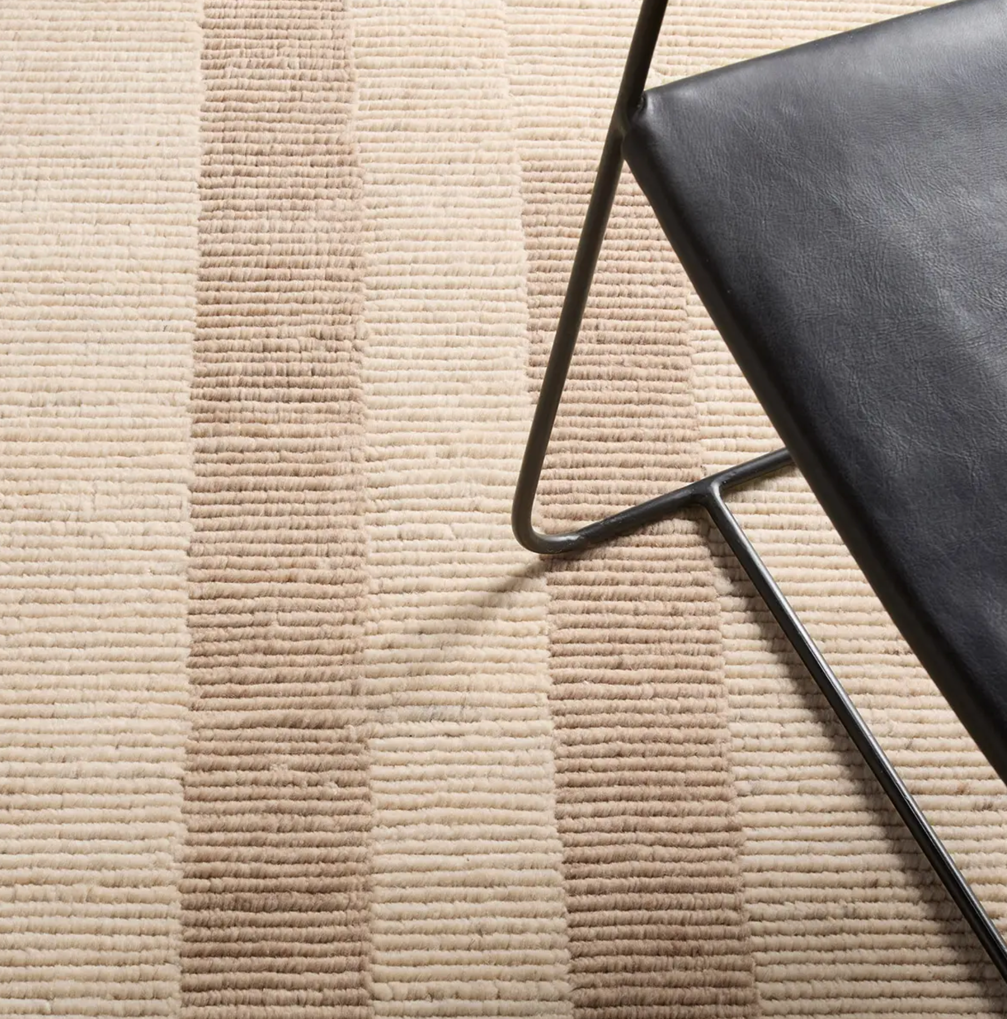 The Caledonia design from the In The Distance collection masterfully blends Scandinavian warmth with Japanese minimalism through its thoughtfully designed, neutral palette. Handcrafted from Afgan Wool, its ivory and tan beige tones feature subtle abrash dyeing, creating a serene, low pile with a distinct ribbed texture and elevated geometric stripes.