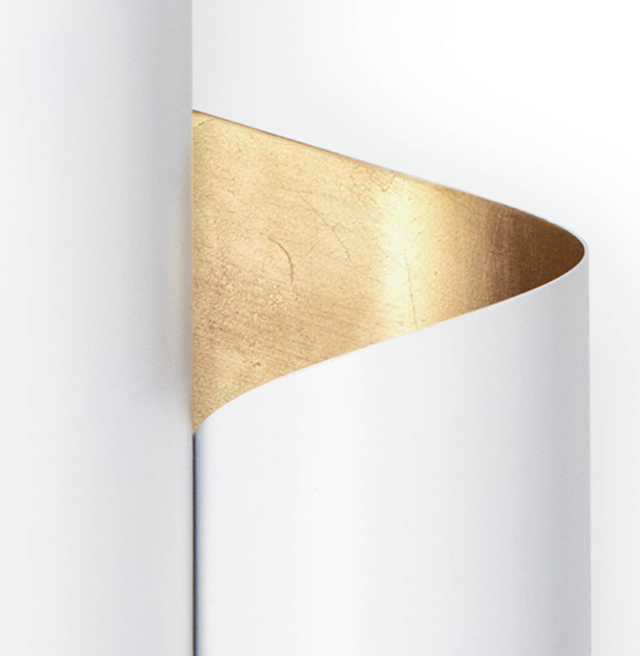 The Coric's Sconce's exterior is uniquely contrasted by its almost paper-like metal that has been expertly formed to achieve an effortless curved shape. Contrasting gold leaf interior peeks out from Coric's curving exterior and truly comes alive when lit. This sconce is the perfect, modern statement in a bedroom, living room, hallway or entry.