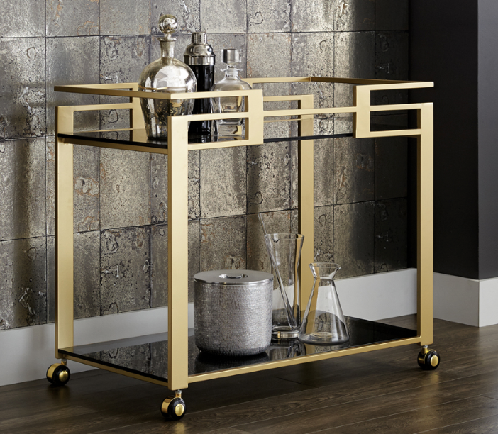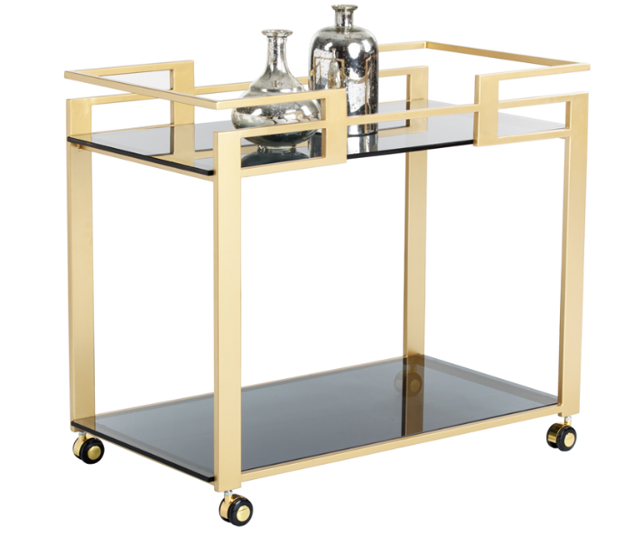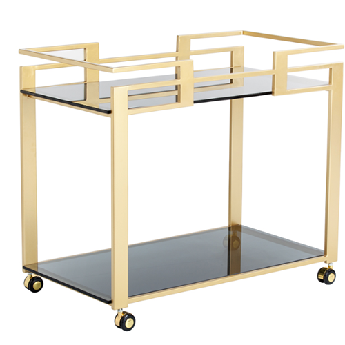 This glamorous and versatile bar cart is perfect as a storage or serving station in living and dining spaces. Stylishly constructed with a matte gold steel frame with two black glass shelves. Castors included
