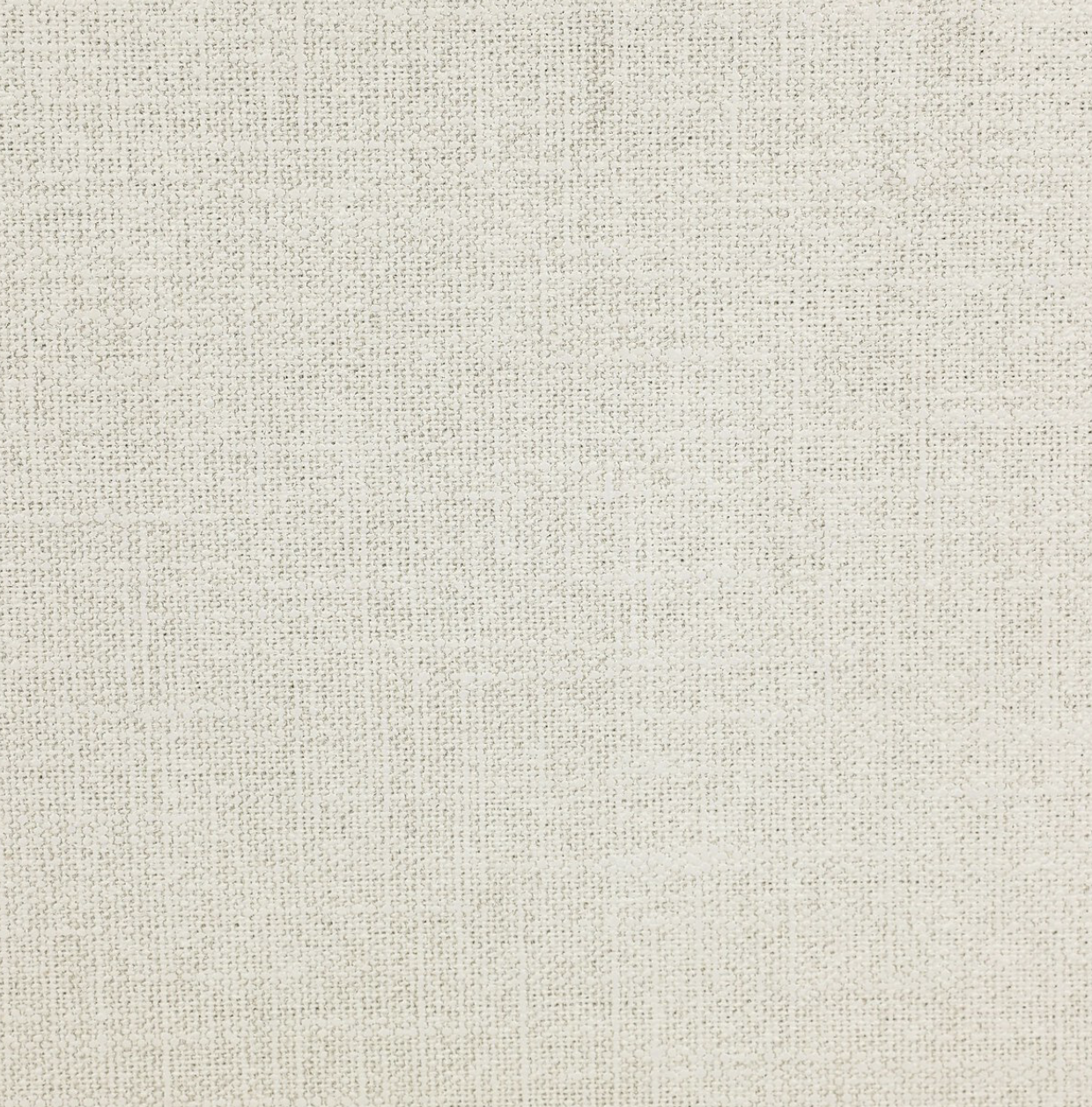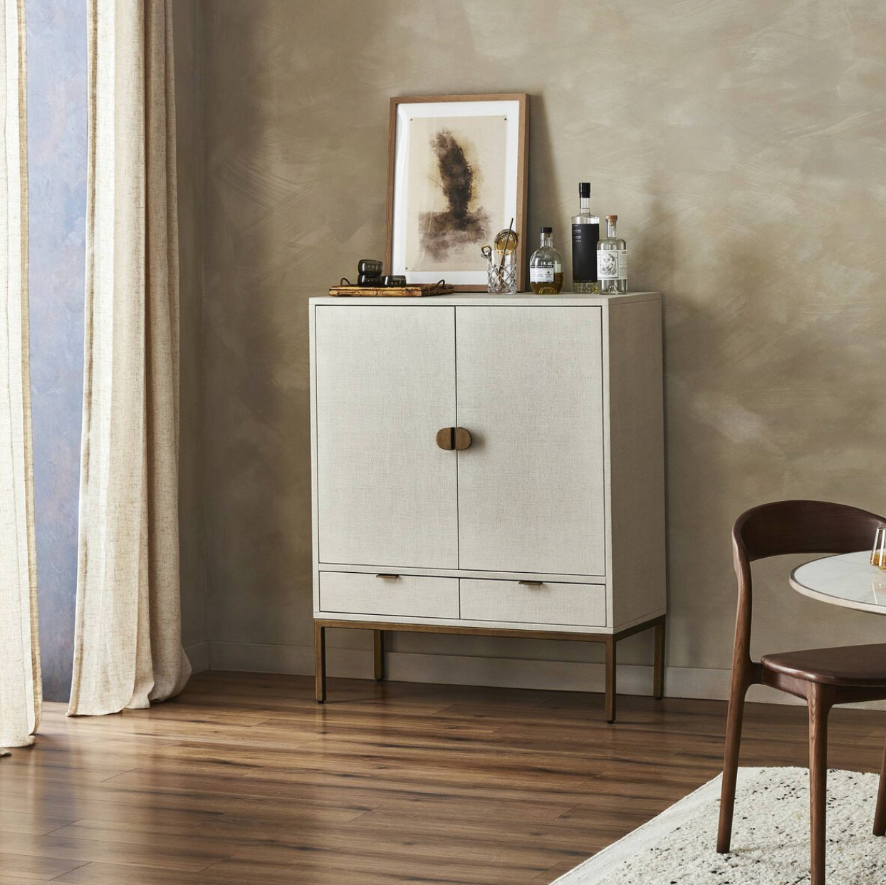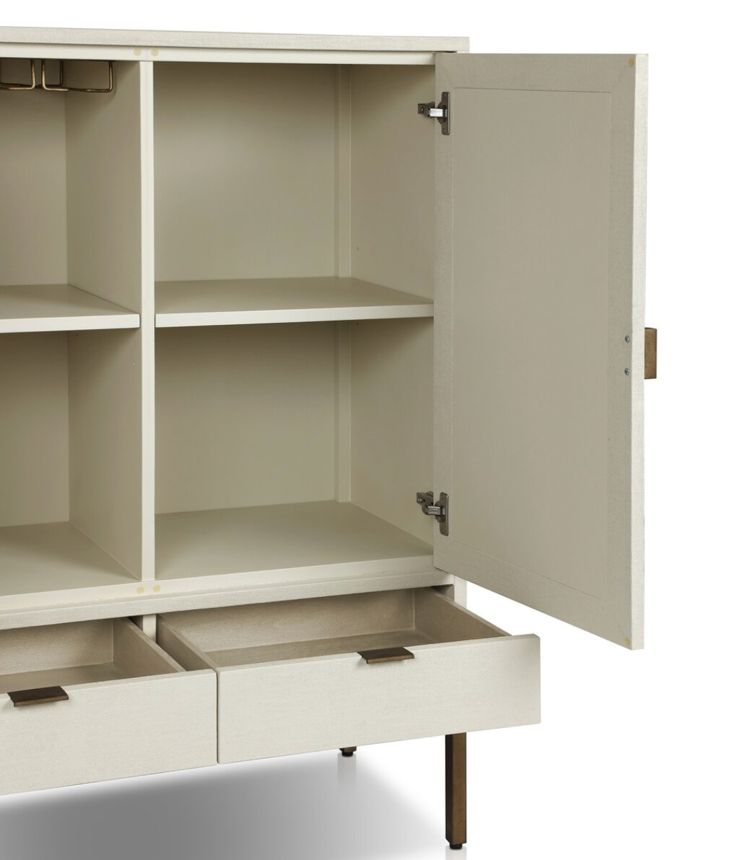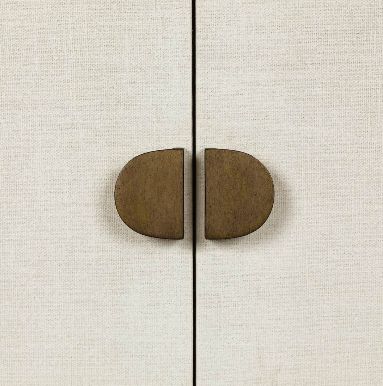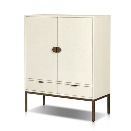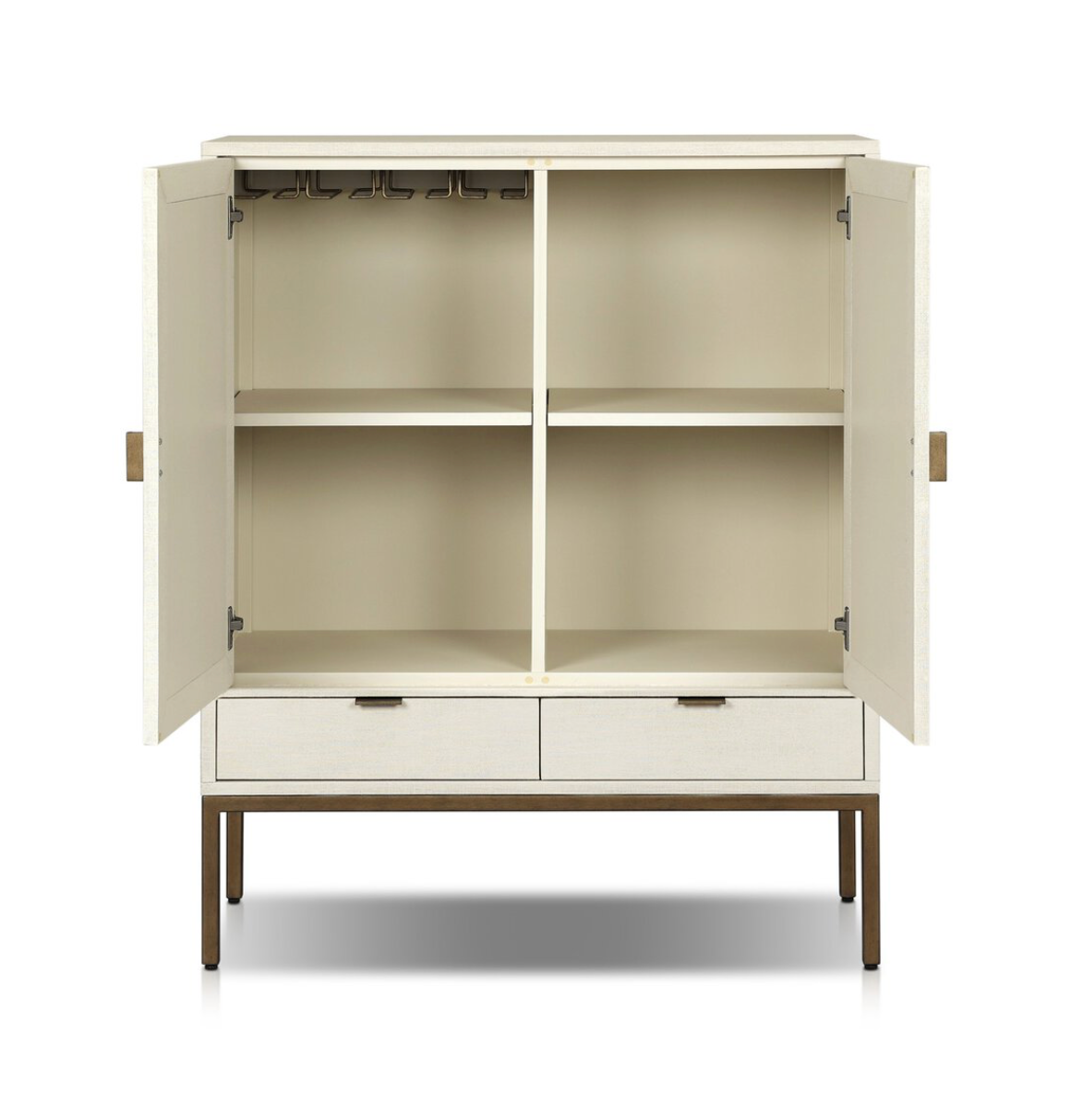 Ivory painted linen pairs with an airy mahogany base, for a clean, fresh look. Unique half-moon iron is finished in antique brass, with two lower drawers for bonus storage.