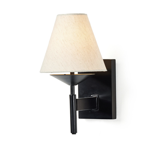This modern-meets-traditional sconce features a smooth jet black iron frame that contrasts perfectly with tapered, 100% cotton linen shade.