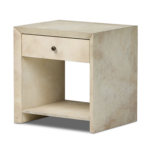 Bring storage to the bedside with a special piece inspired by material parchment used in Seventies design. This single-drawer nightstand is fully wrapped in natural vellum in a versatile taupe, and simply shaped to let this specialty material shine.