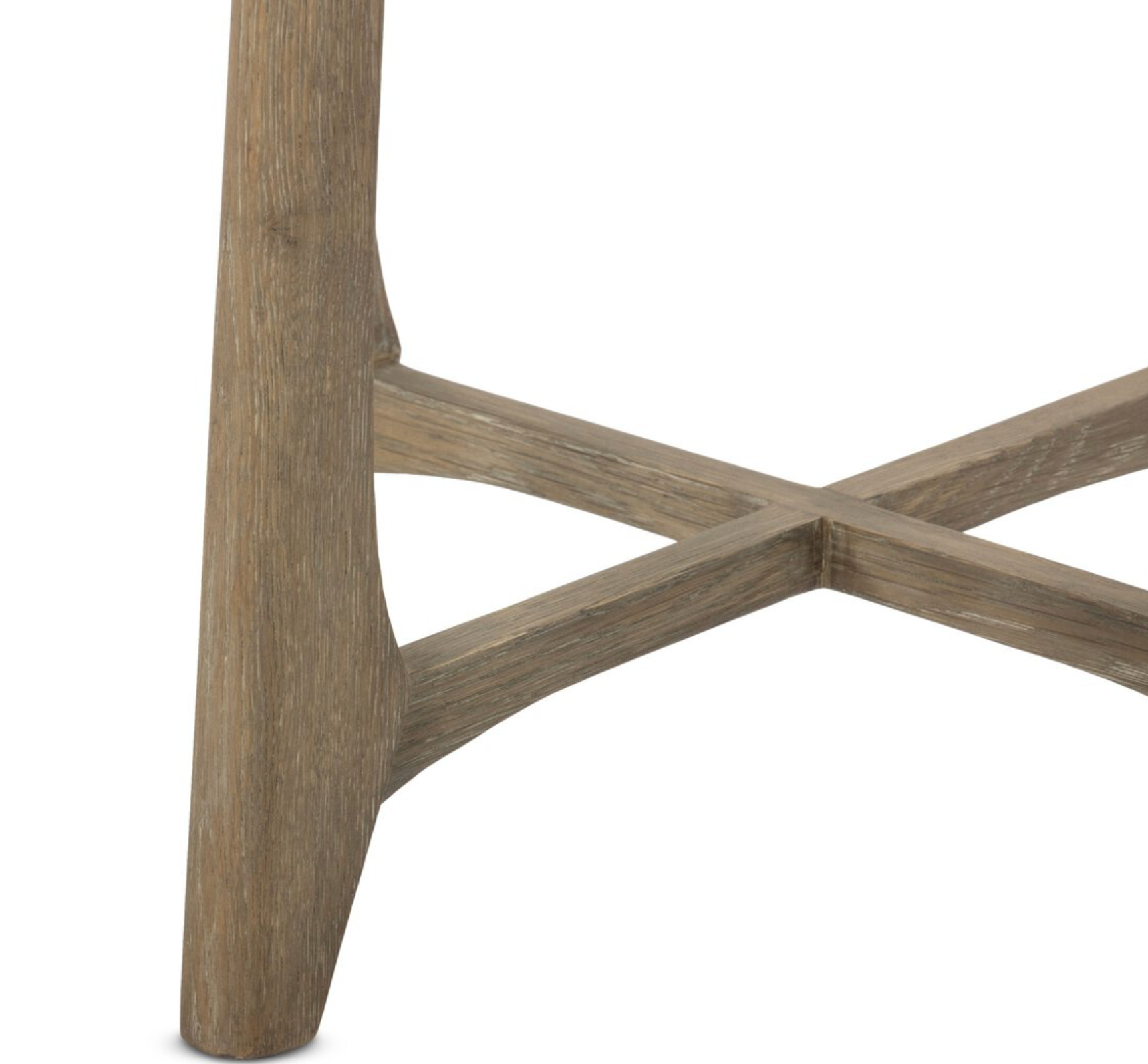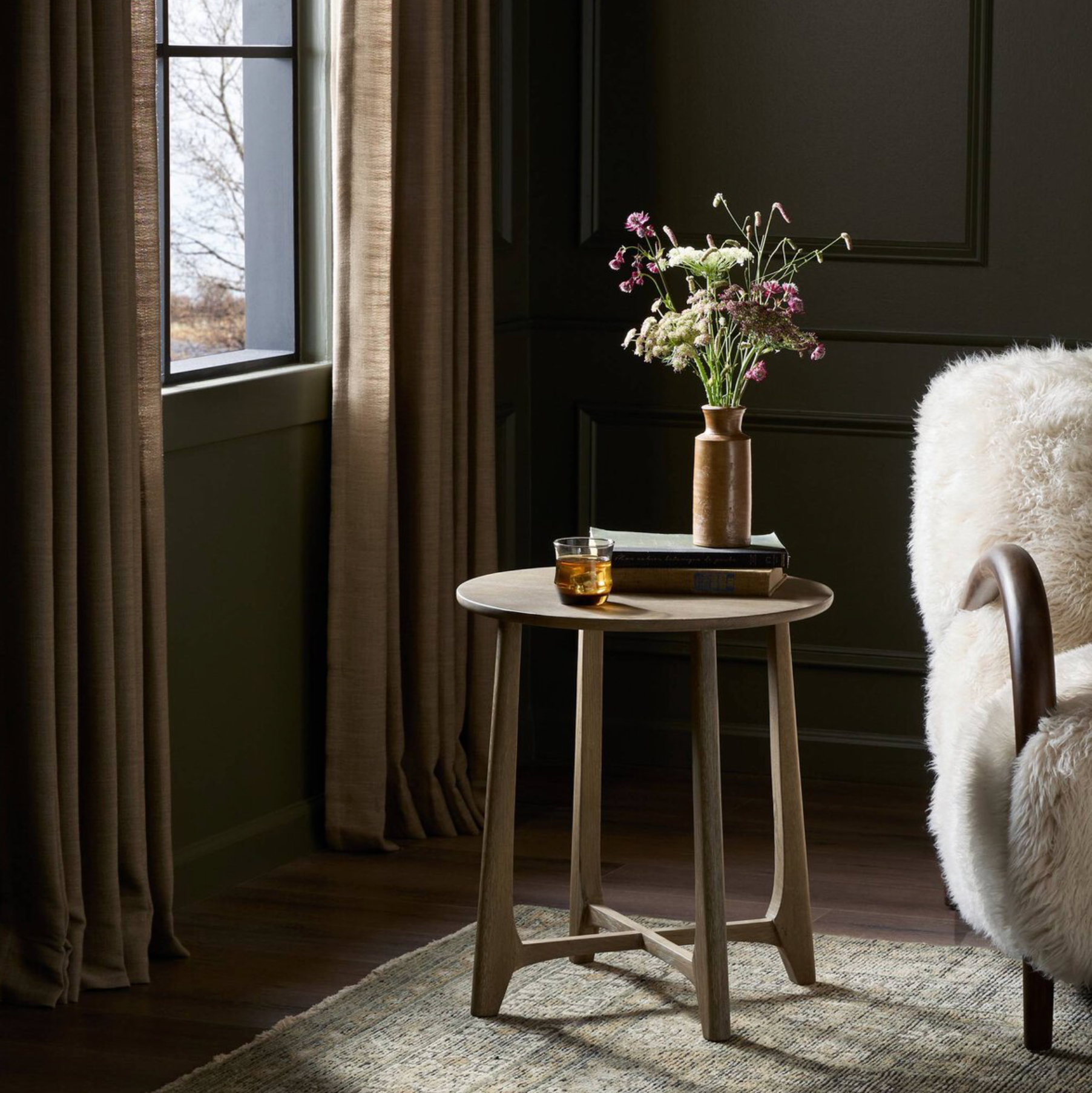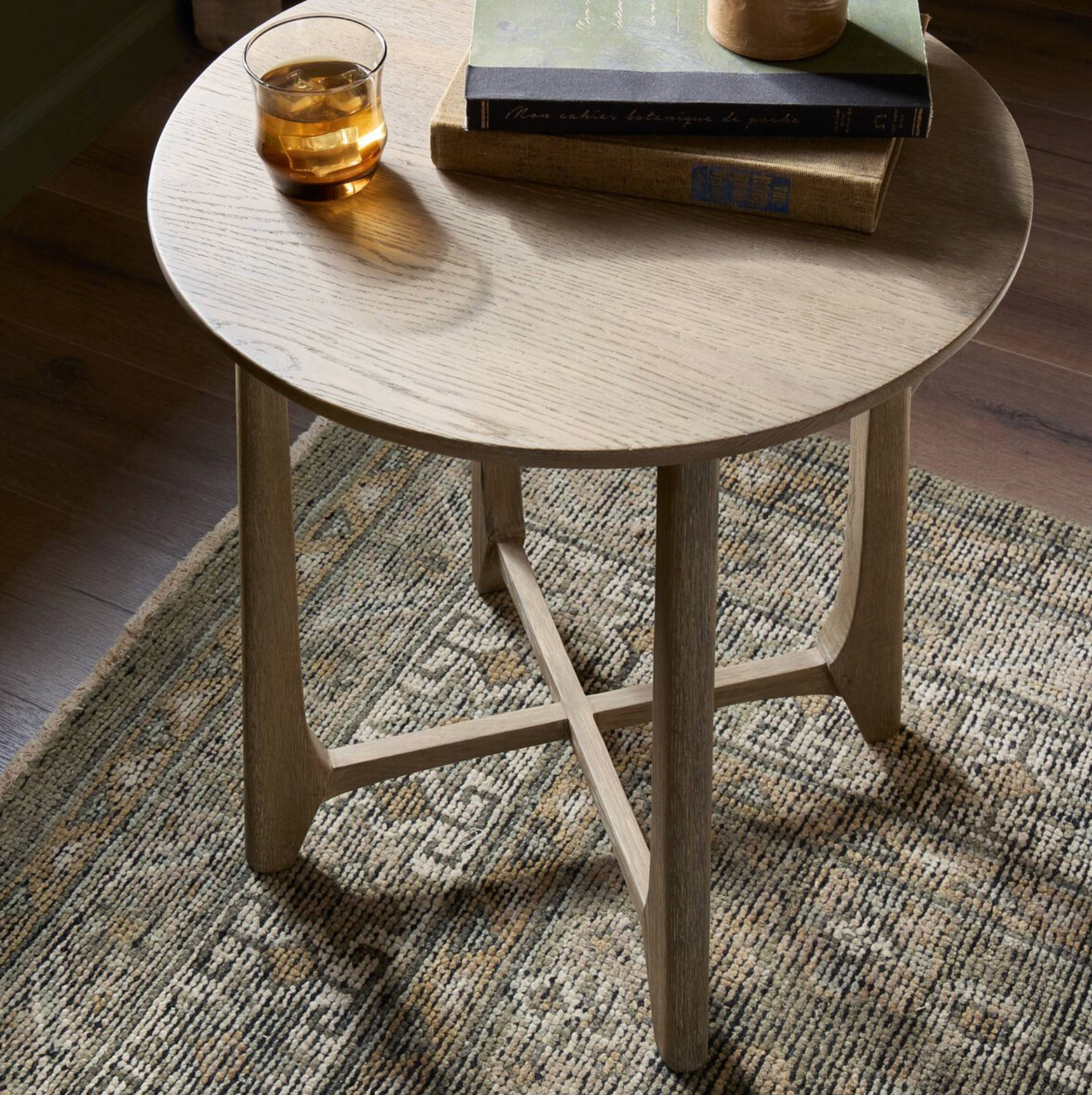 A simple oak table with a warm, light finish features subtle leg details for an artisan touch. Perfectly sized to keep your favorite book or drink within reach, in any space or style.