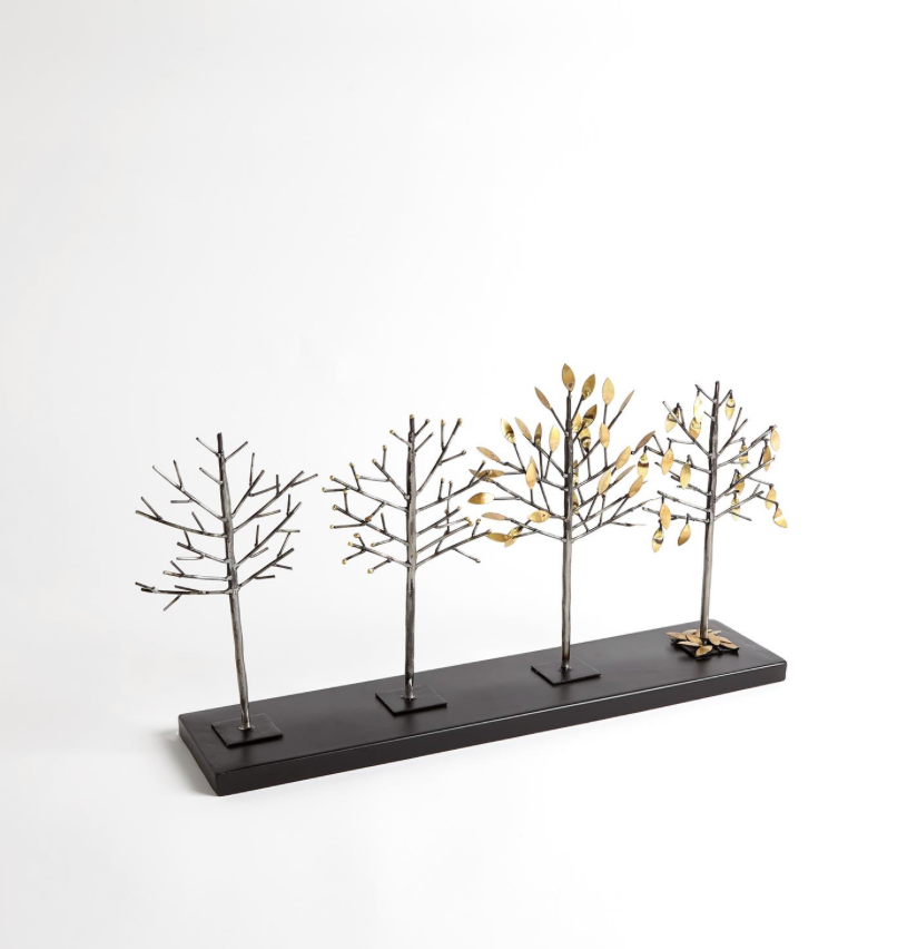 Iron takes shape into the four seasons beautifully. Gold leaves on the branches show the change in climate in a whimsical way.