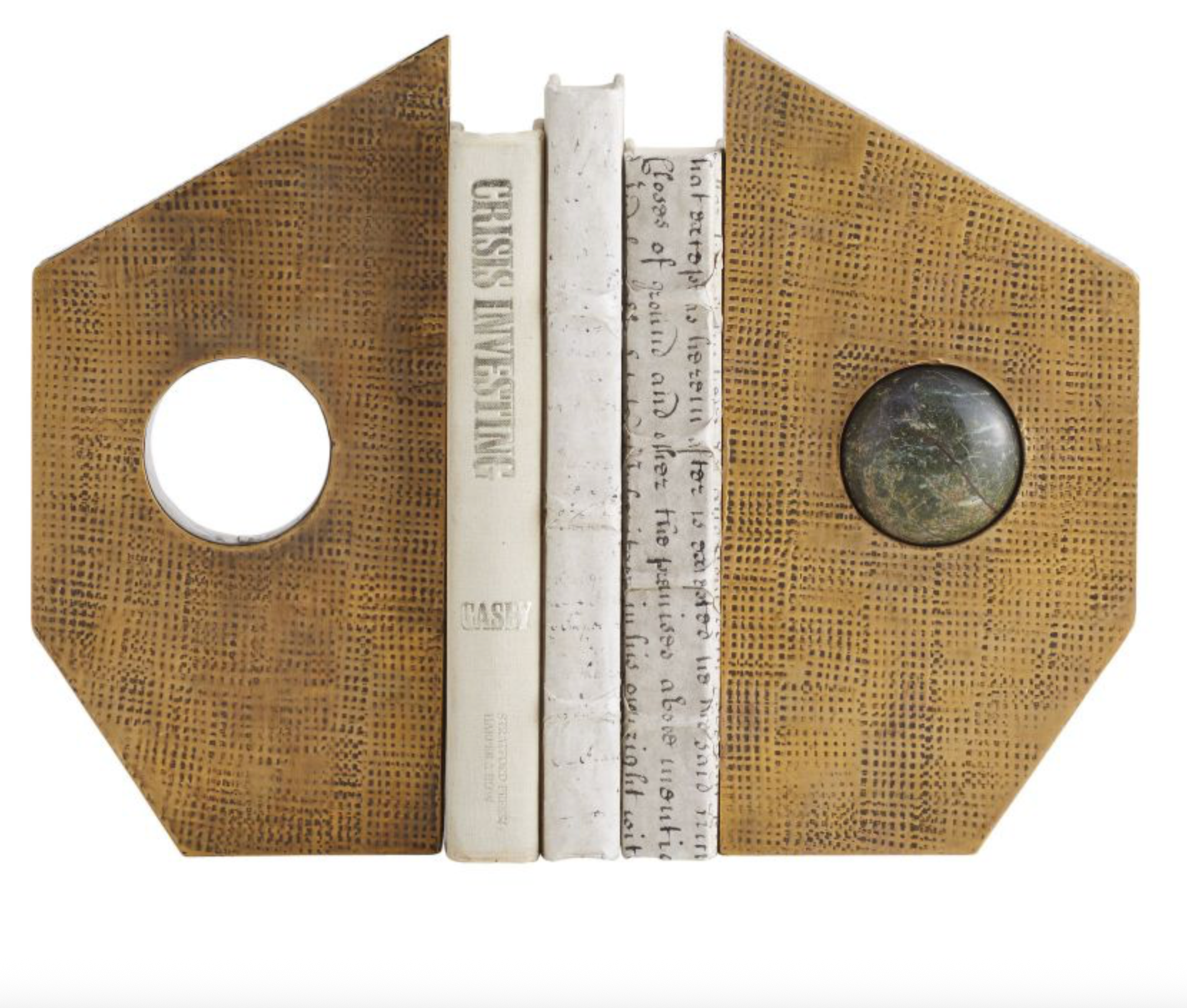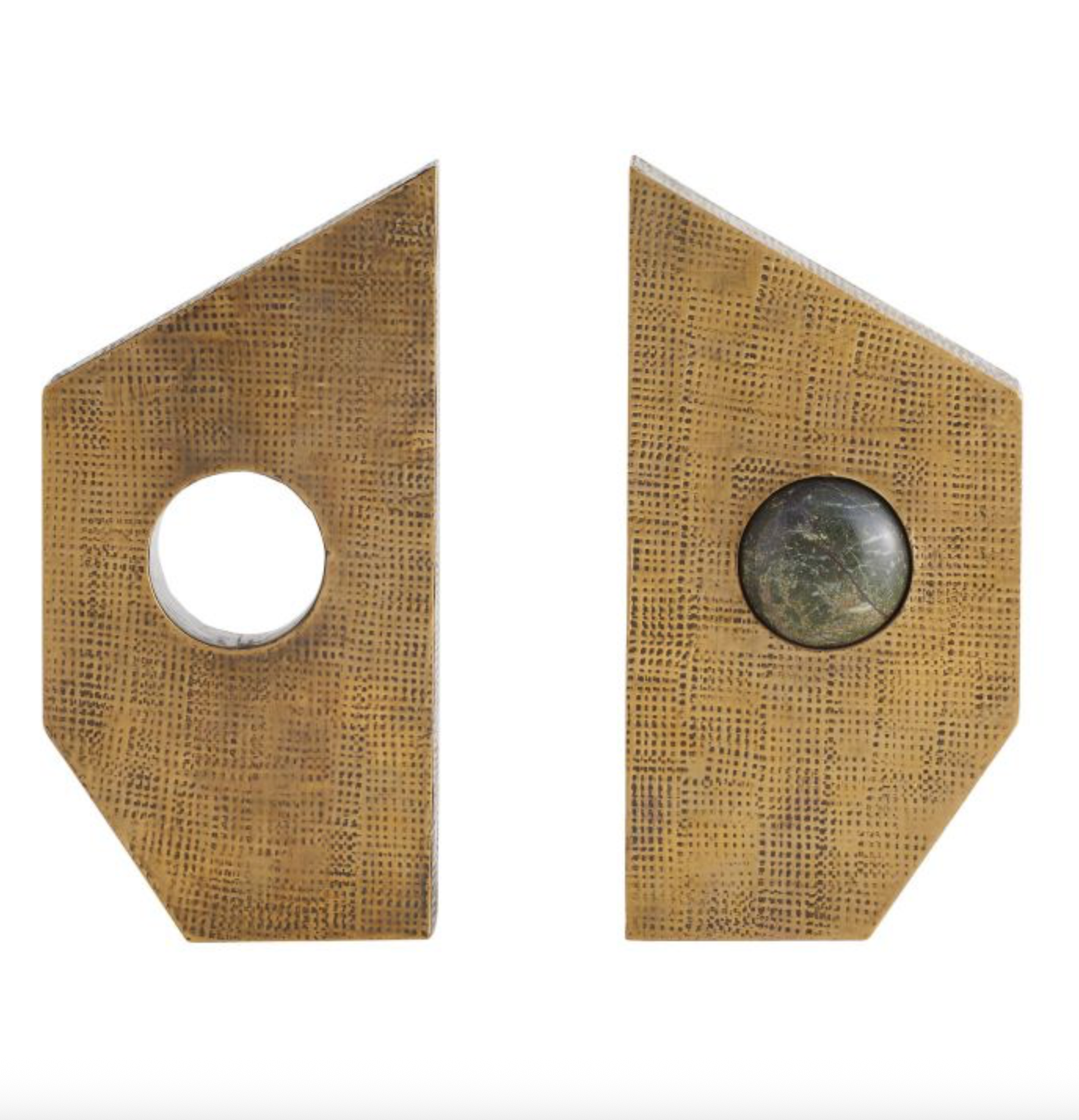 Evoking classic architectural forms, antique brass clad bookends possess a geometric texture. A single orb of jungle marble adds a playful, puzzle-like accent to one of the pair. Finish will vary.