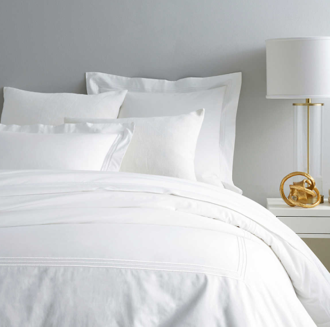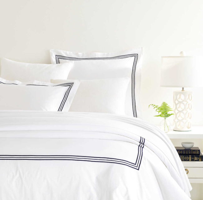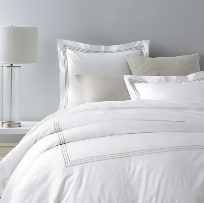 A simple, three-lined pattern adds a touch of refinement to this classic white, 400 thread-count cotton duvet cover. Coordinate with a variety of hues from neutral to bright for an easy, sophisticated look.
