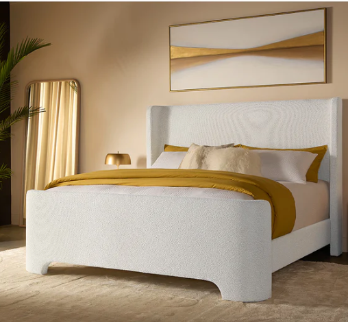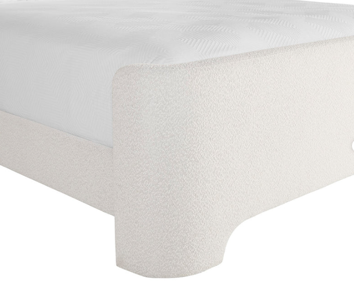 Sculpted subtle curves give the Ivan Bed a gentle profile designed for the perfect slumber. Fully upholstered in white boucle fabric. No box spring is required and slats are included.