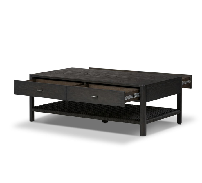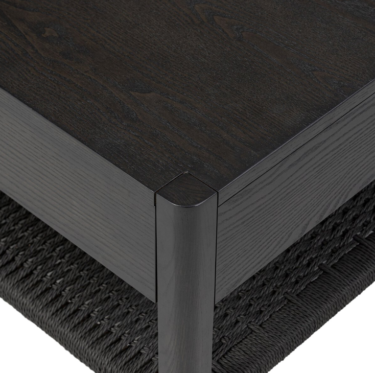 A Danish-inspired design celebrates simple, refined shaping. Made from solid ash with dual drawers, open shelving of woven paper cord further ups storage and display options.
