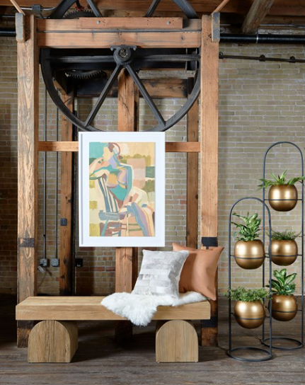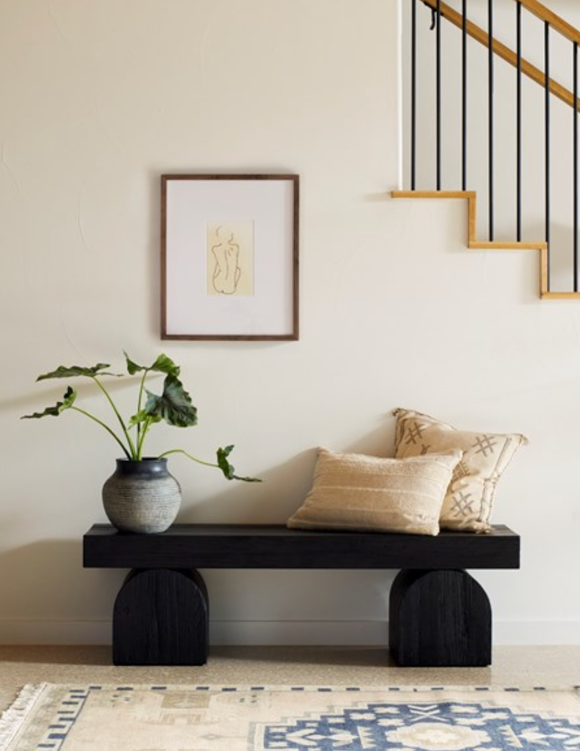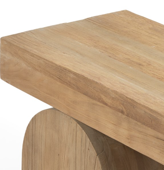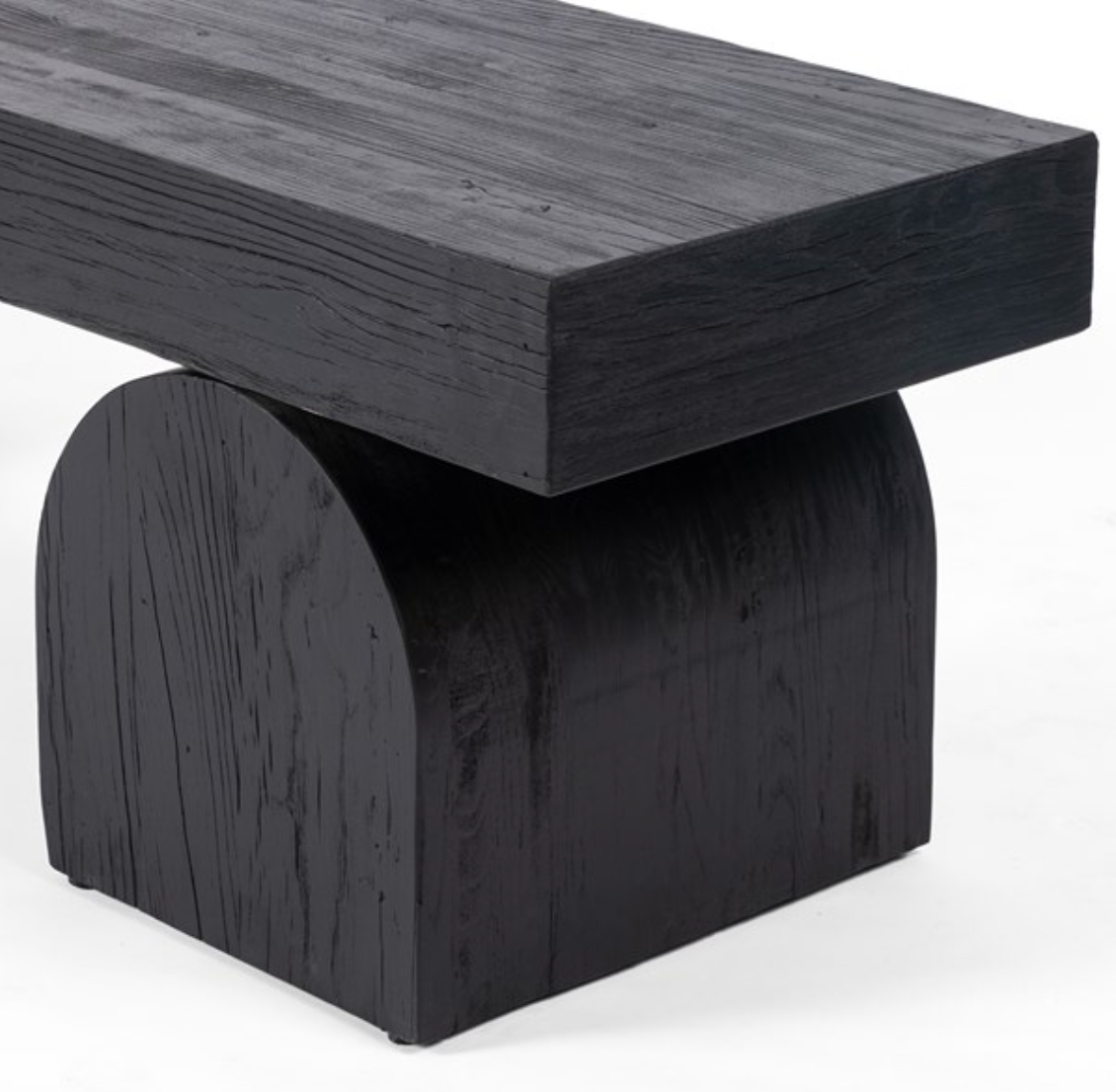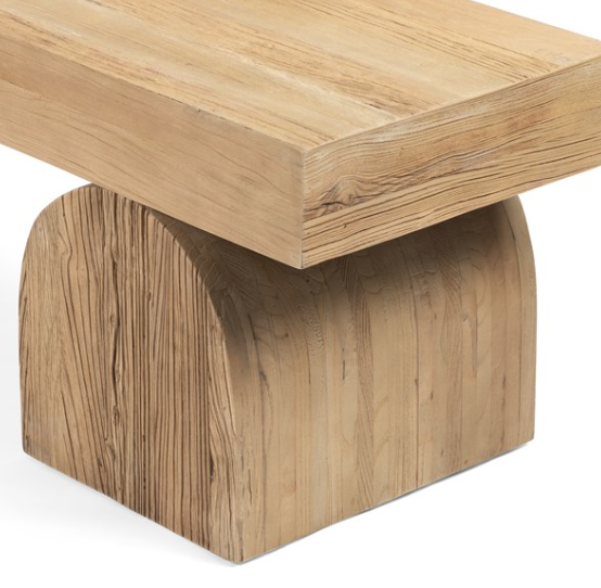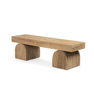 A study in shape. Handcrafted from solid reclaimed elm with visible knots and graining, chunky arched legs support clean bench-style seating. An ideal pop of modernity in the entryway and beyond.