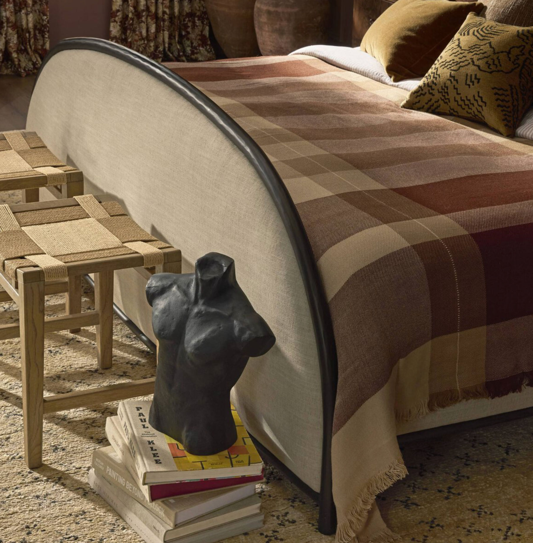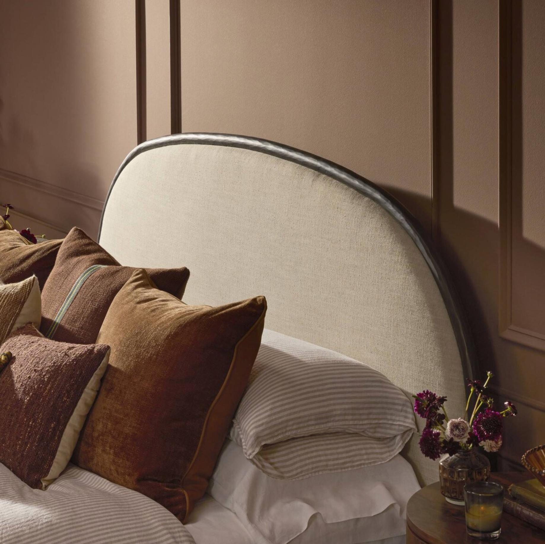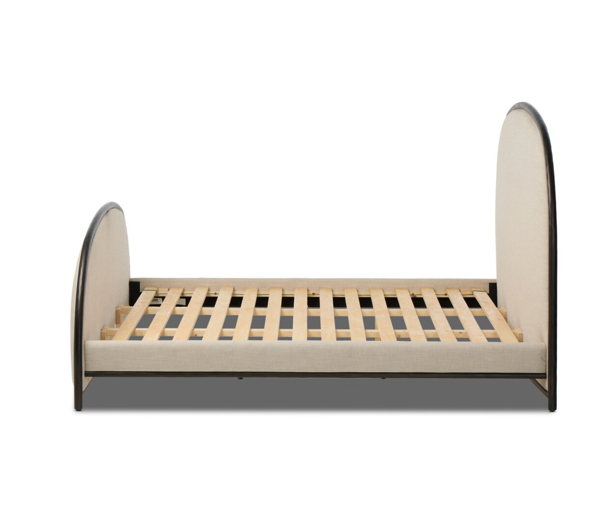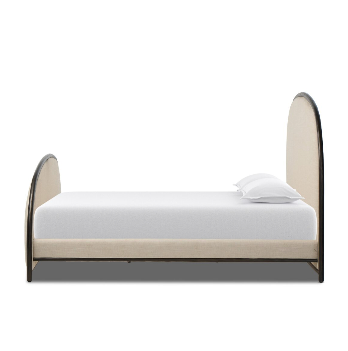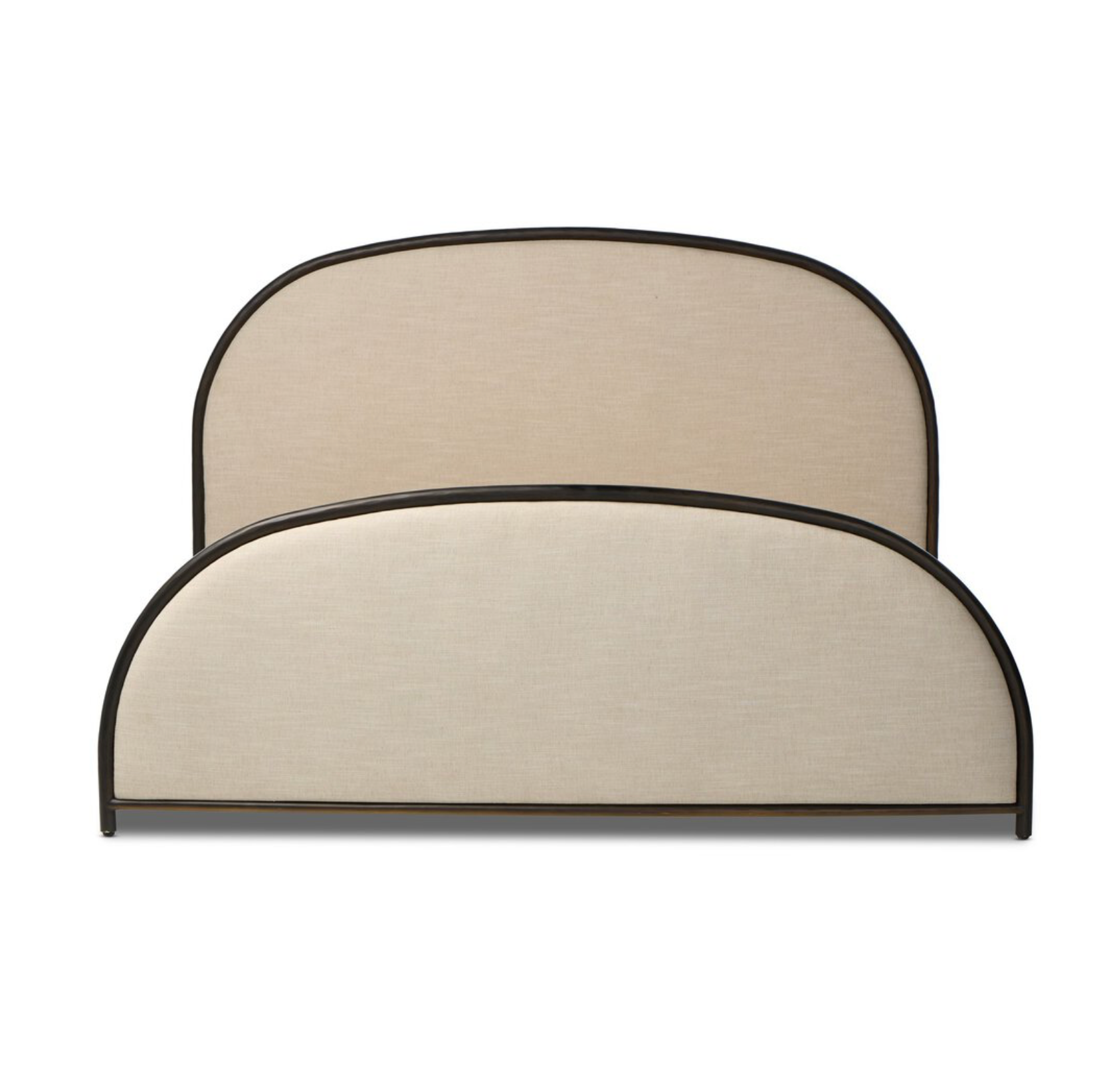 A refined balance of craftsmanship and comfort, suited to both modern and classic interiors. Sculptural for its half-crescent headboard and footboard, this welcoming bed is framed in hand-forged dark metal. The arches lend architectural presence and neutral upholstered panels soften the look, adding warmth and versatility.