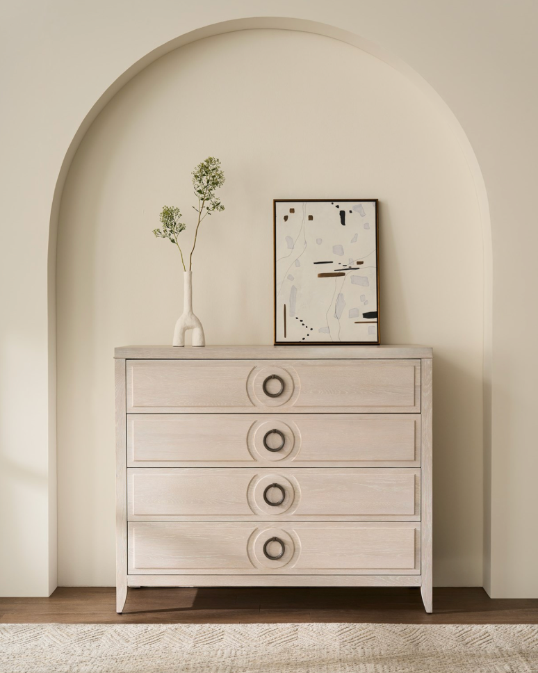 The Lisbet Chest is a refined piece of furniture that exudes timeless elegance. Its four spacious drawers, adorned with sleek metal ring pulls and intricate circular detailing, offer ample storage space. The rich White Oak finish adds a touch of sophistication, making this chest a captivating addition to any bedroom.