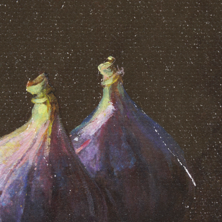 Deep plum and burgundy tones in the figs are set against a shadowy charcoal and espresso backdrop, accented by warm golden highlights and muted olive.