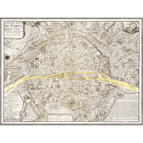 A lovely sienna toned historical map of Paris enhanced with the river seine in gold gild. This 1702 treasure is framed in an warm weathered grey wood profile with polished silver face. Matching London available.
