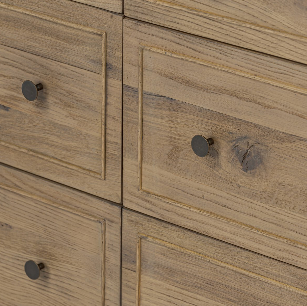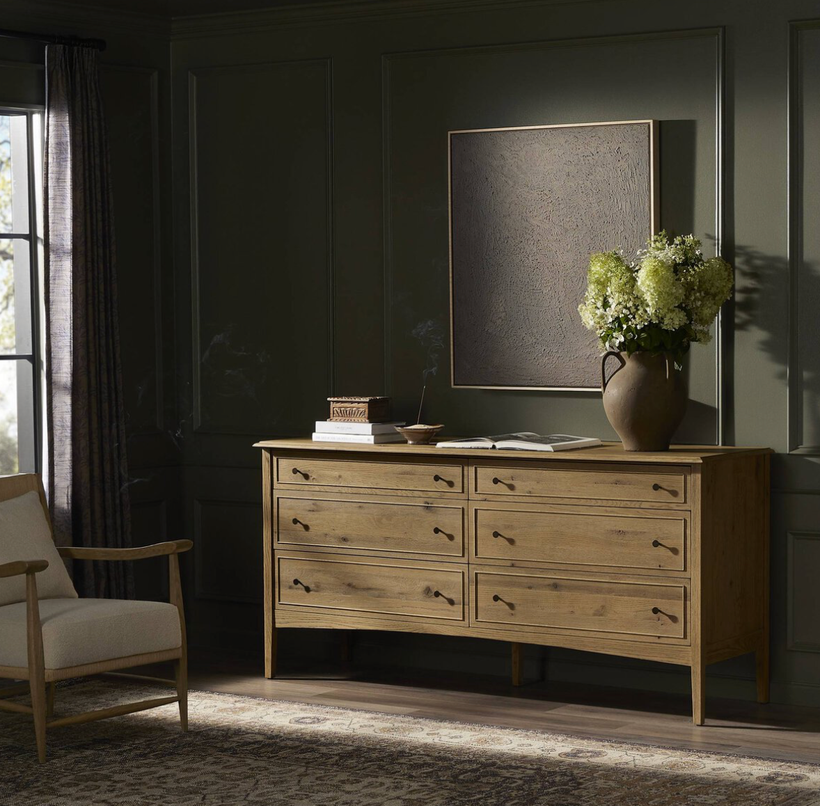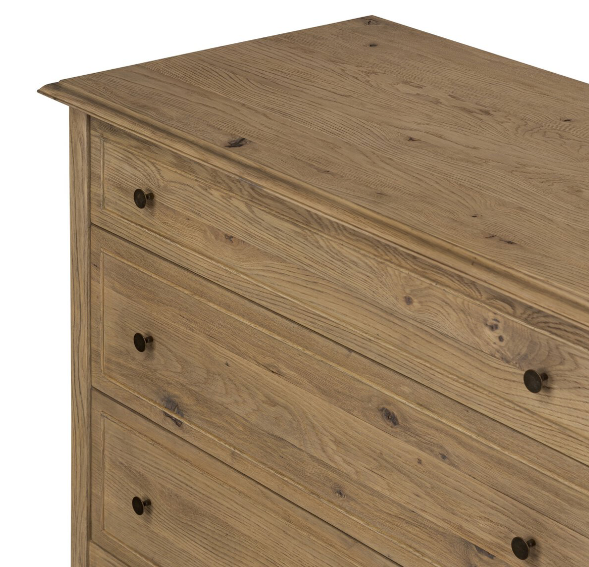 A cleanly shaped six-drawer dresser is crafted from aged smoked oak, highlighting the wood's natural grain. Roomy drawers offer plenty of space for bedroom storage, while the slim, tapered legs give the piece a subtle lift, creating a grounded look.