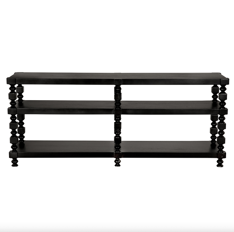 This three-tier console features sculptural spindle legs with alternating turned and faceted forms. Finished in Hand-Rubbed Black, it blends traditional detailing with modern minimalism, making it ideal for transitional interiors that require both decorative interest and open storage.