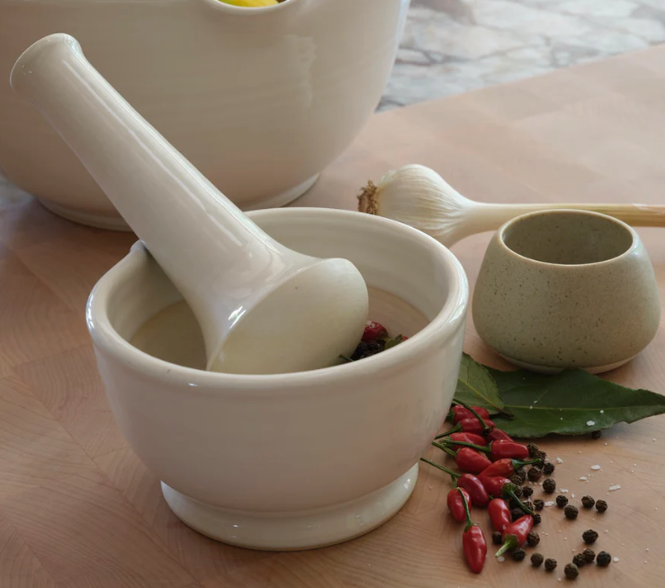 The inside of our mortar and the bottom of our pestle are unglazed, leaving the natural clay surface, which helps grind the ingredients.