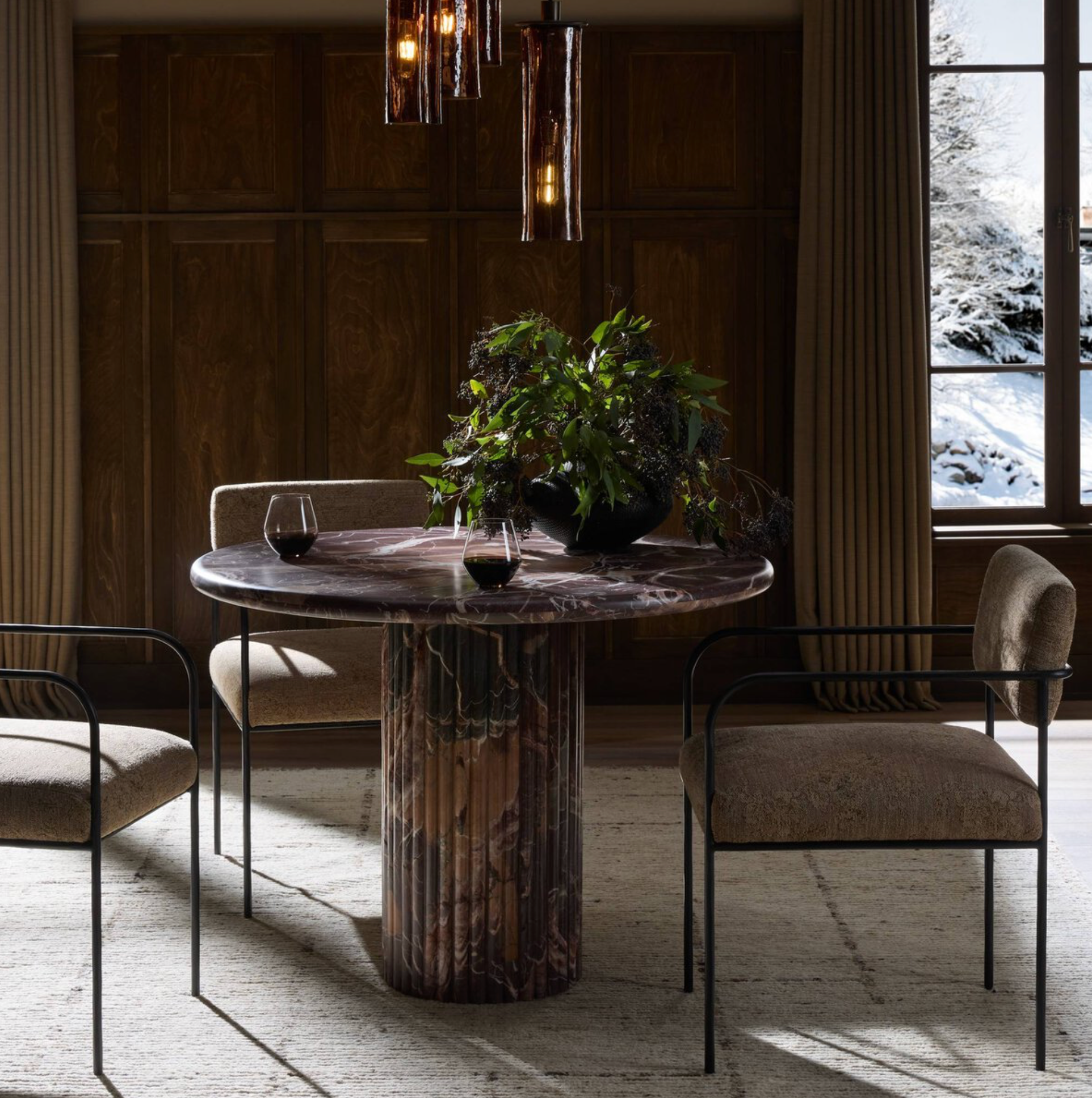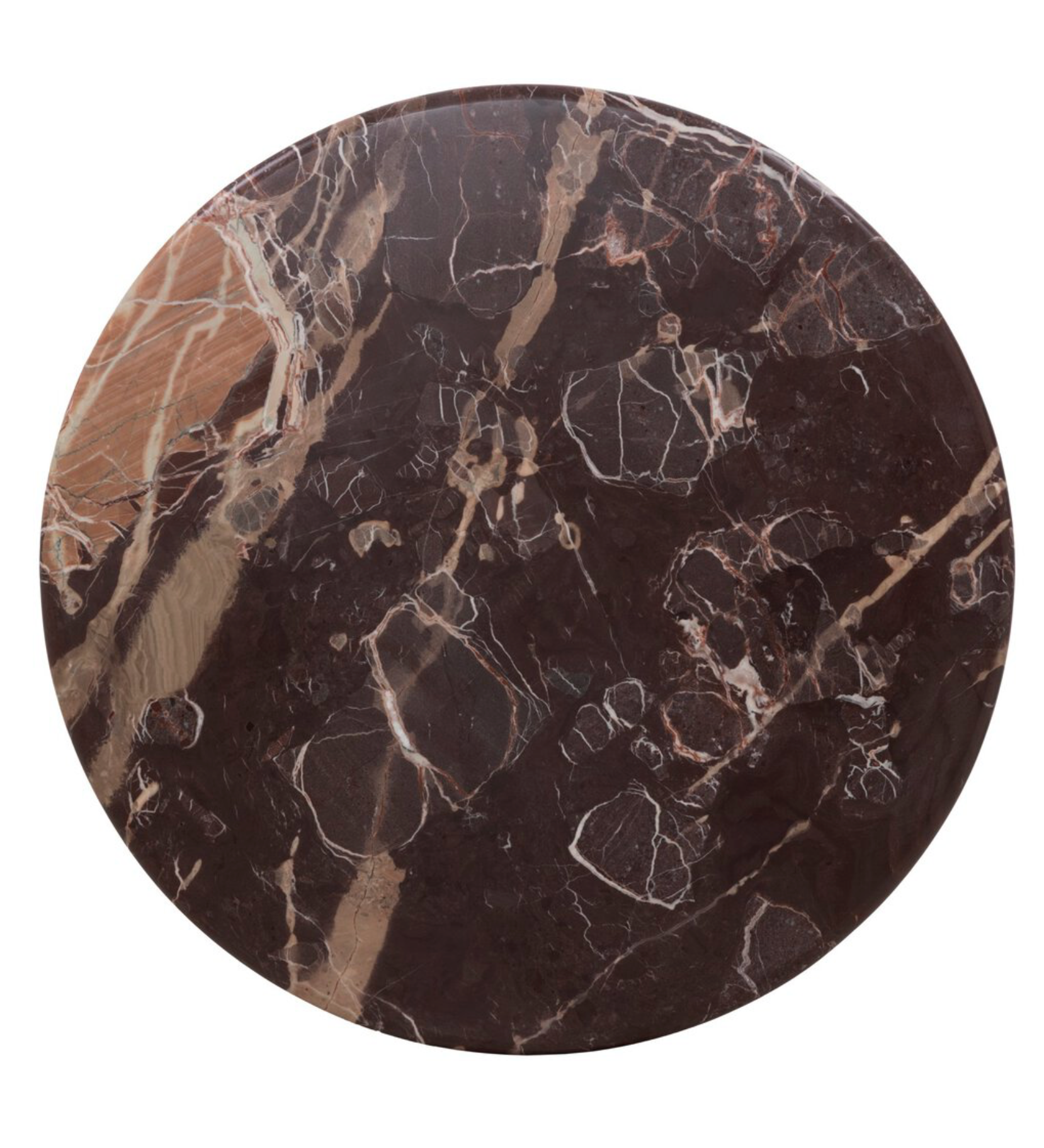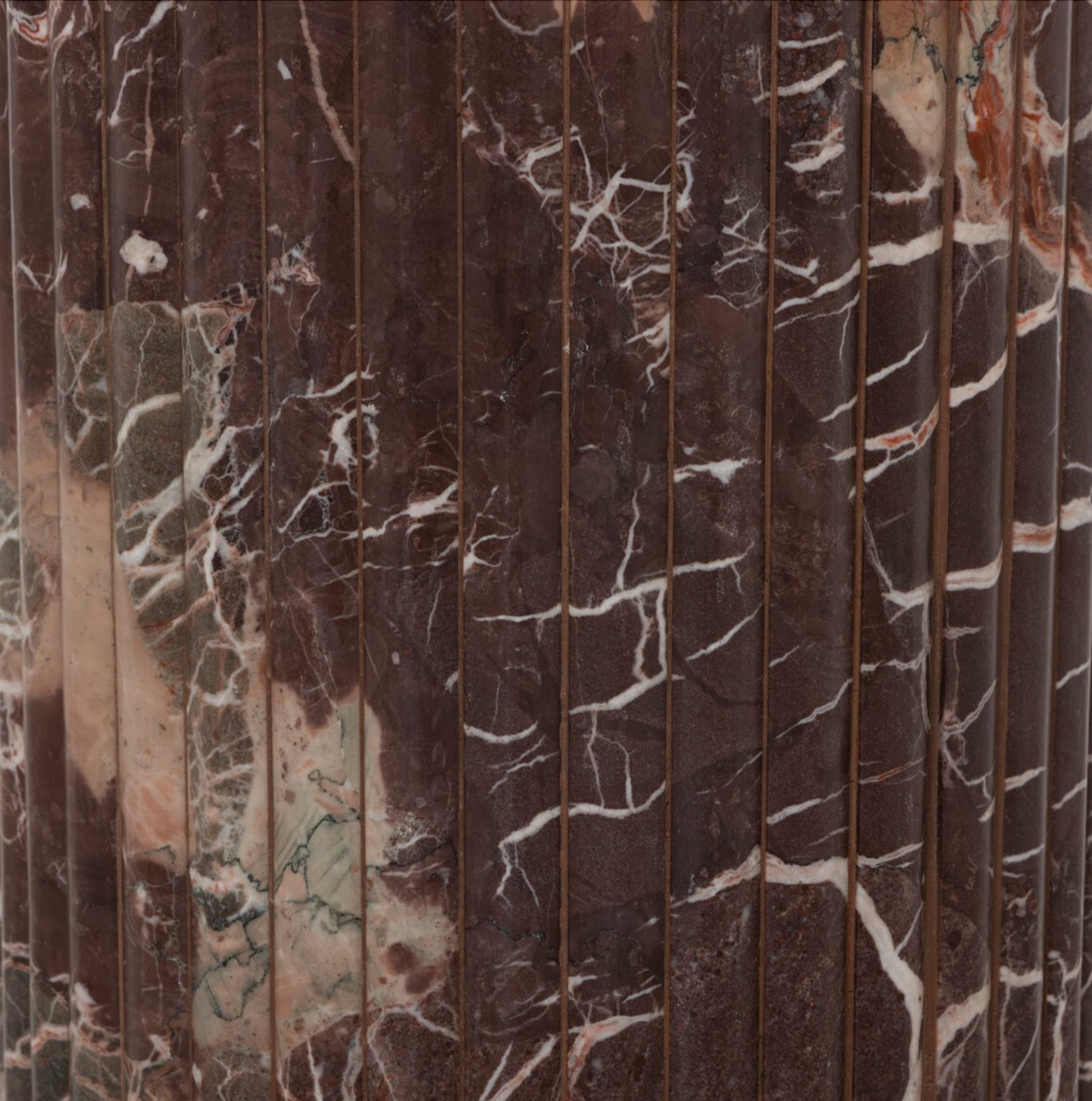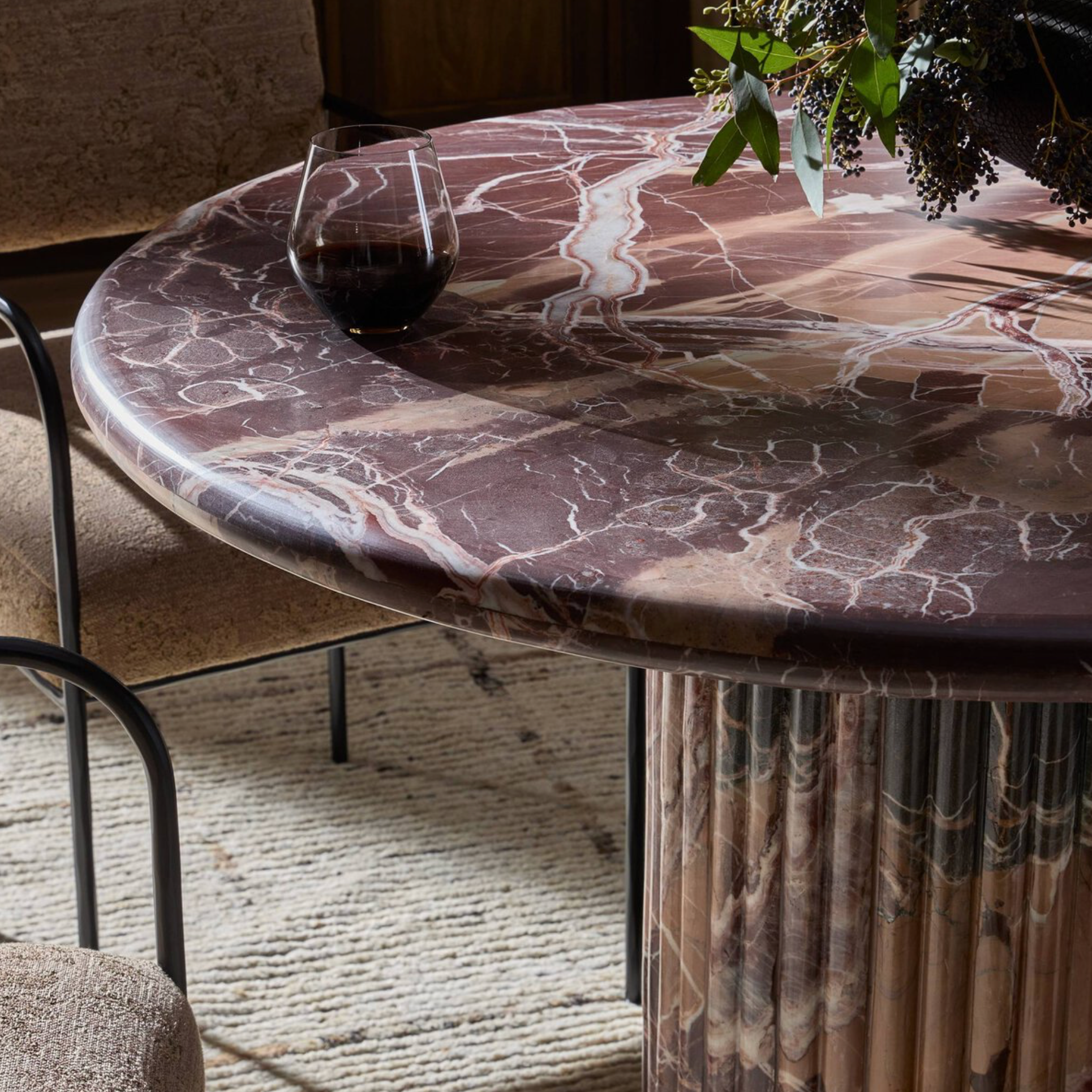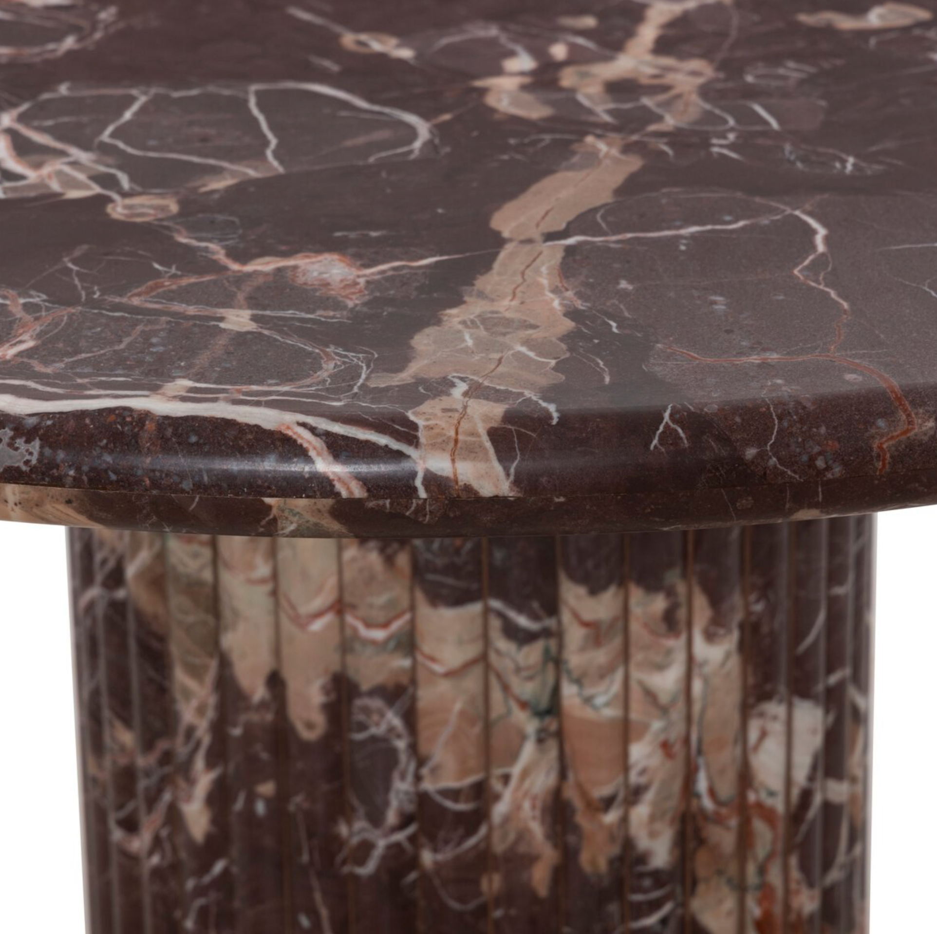 Inspired by Italian design, a swirling marble base is scalloped for a linear look with heavy texture, finished with a rounded, bistro-size tabletop of polished merlot marble.