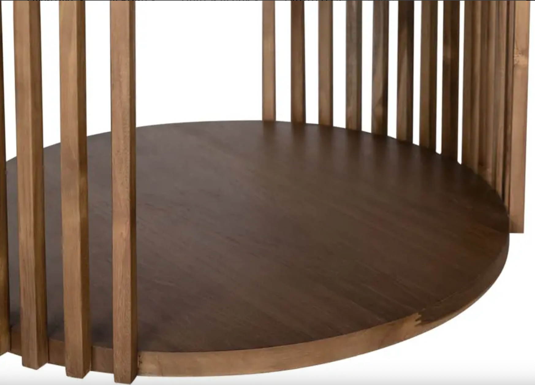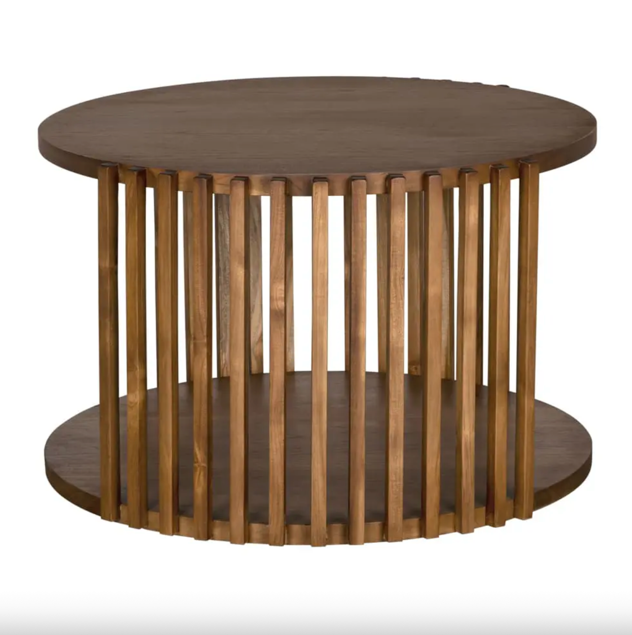 The teak Rialto coffee or side table features a unique slatted frame that creates a sculptural effect. The warmth of the teak, paired with the two-tier design, offers visual interest, blending modern style with organic warmth.