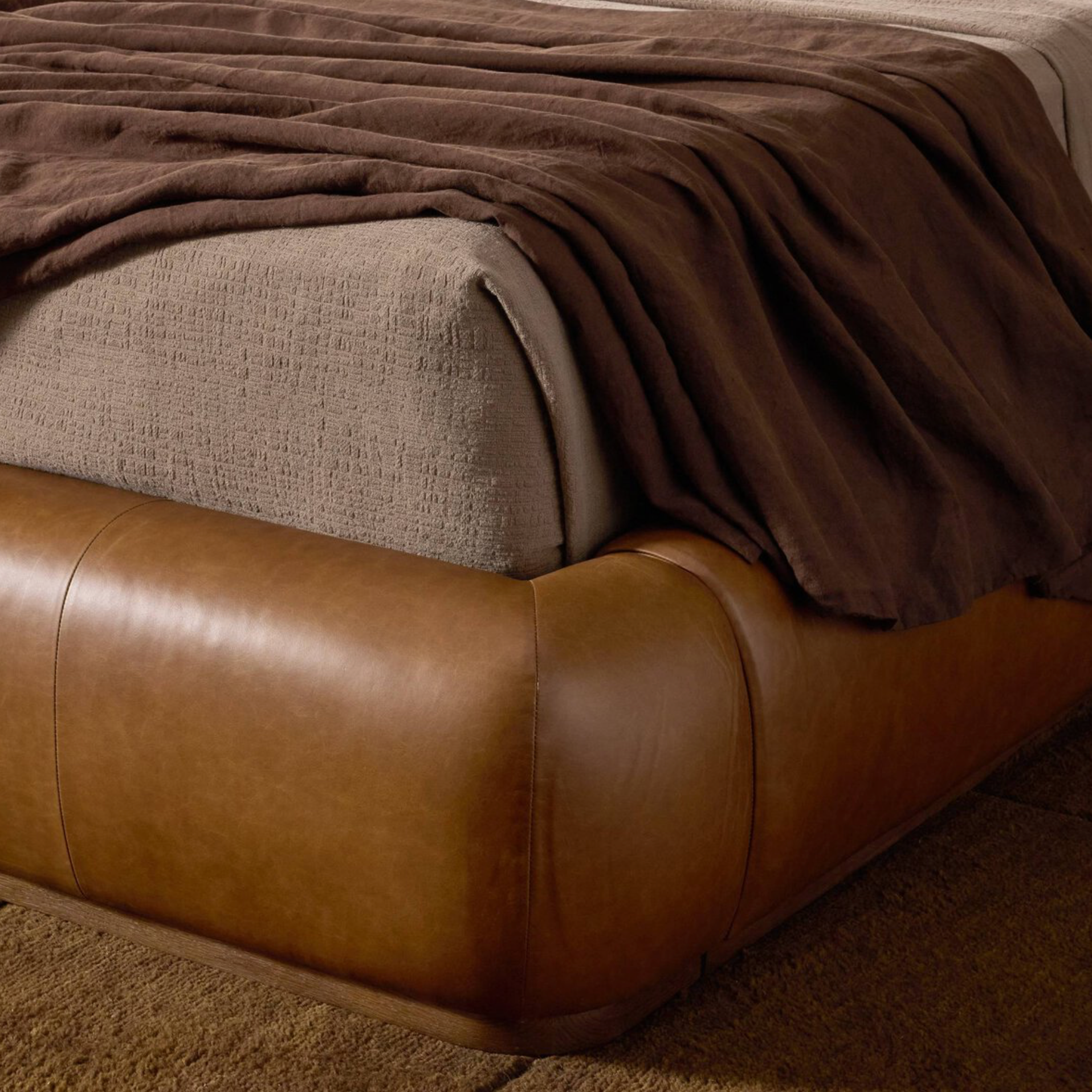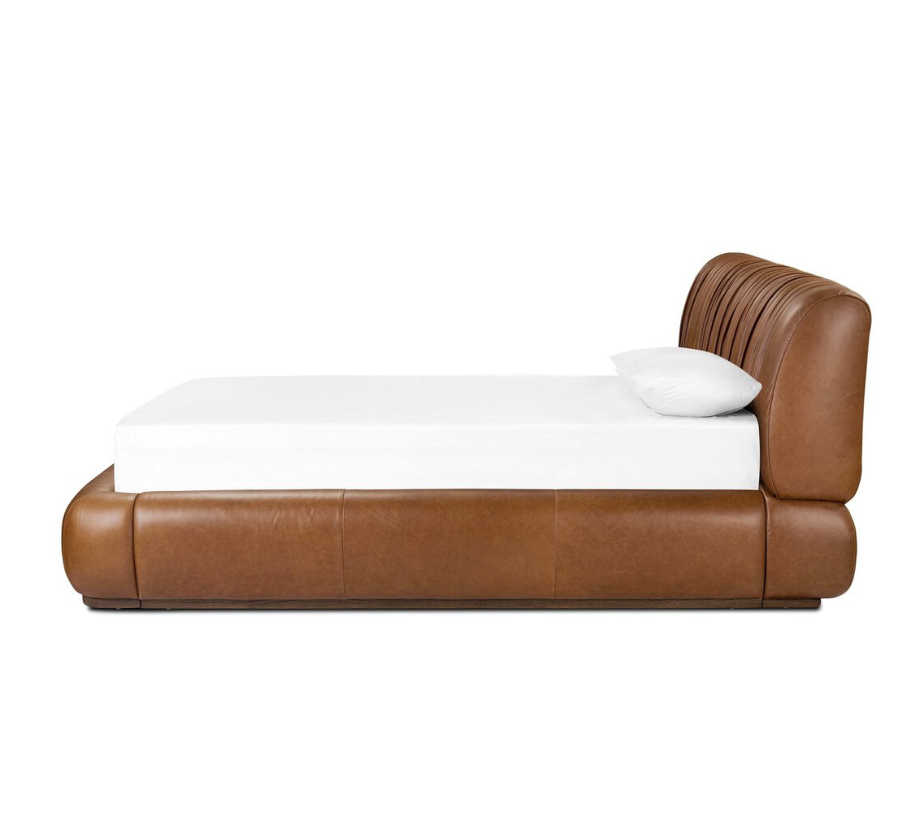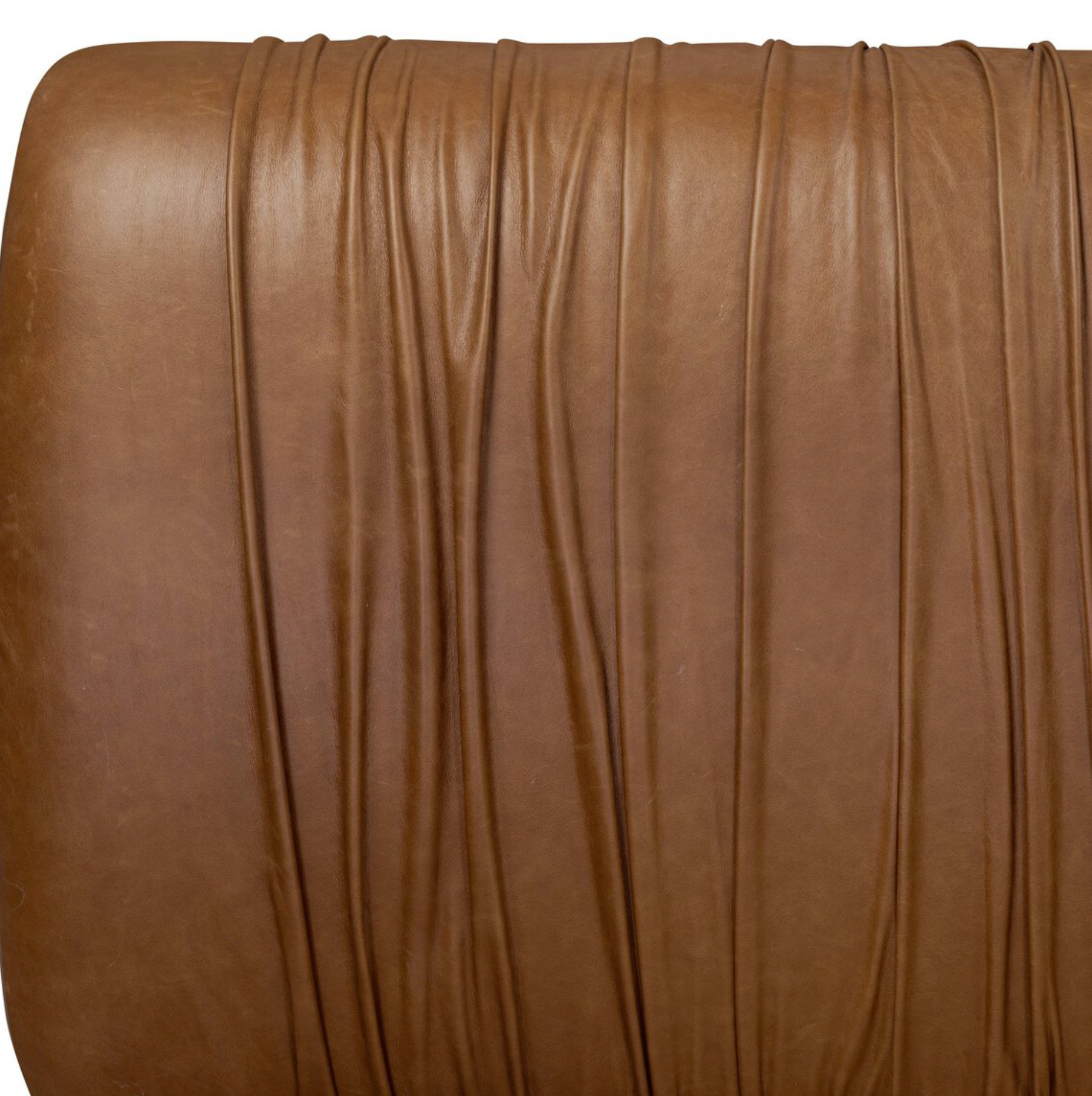 Bring vintage vibes to the bedroom. A sleek, low silhouette is covered in chestnut top-grain leather. A meticulously ruched headboard reflects the Seventies inspiration behind this versatile piece.