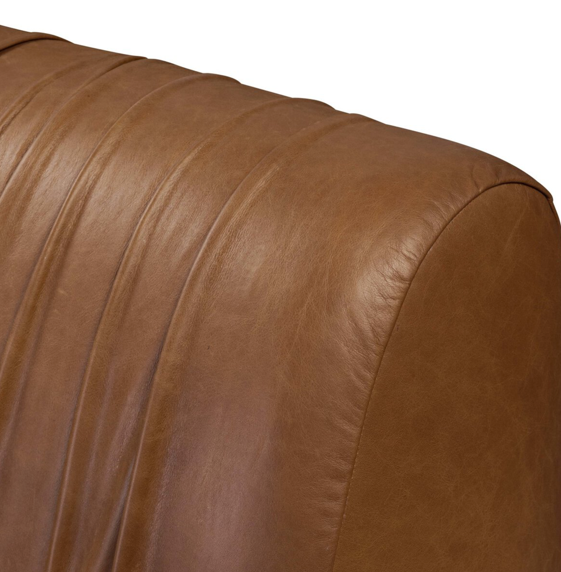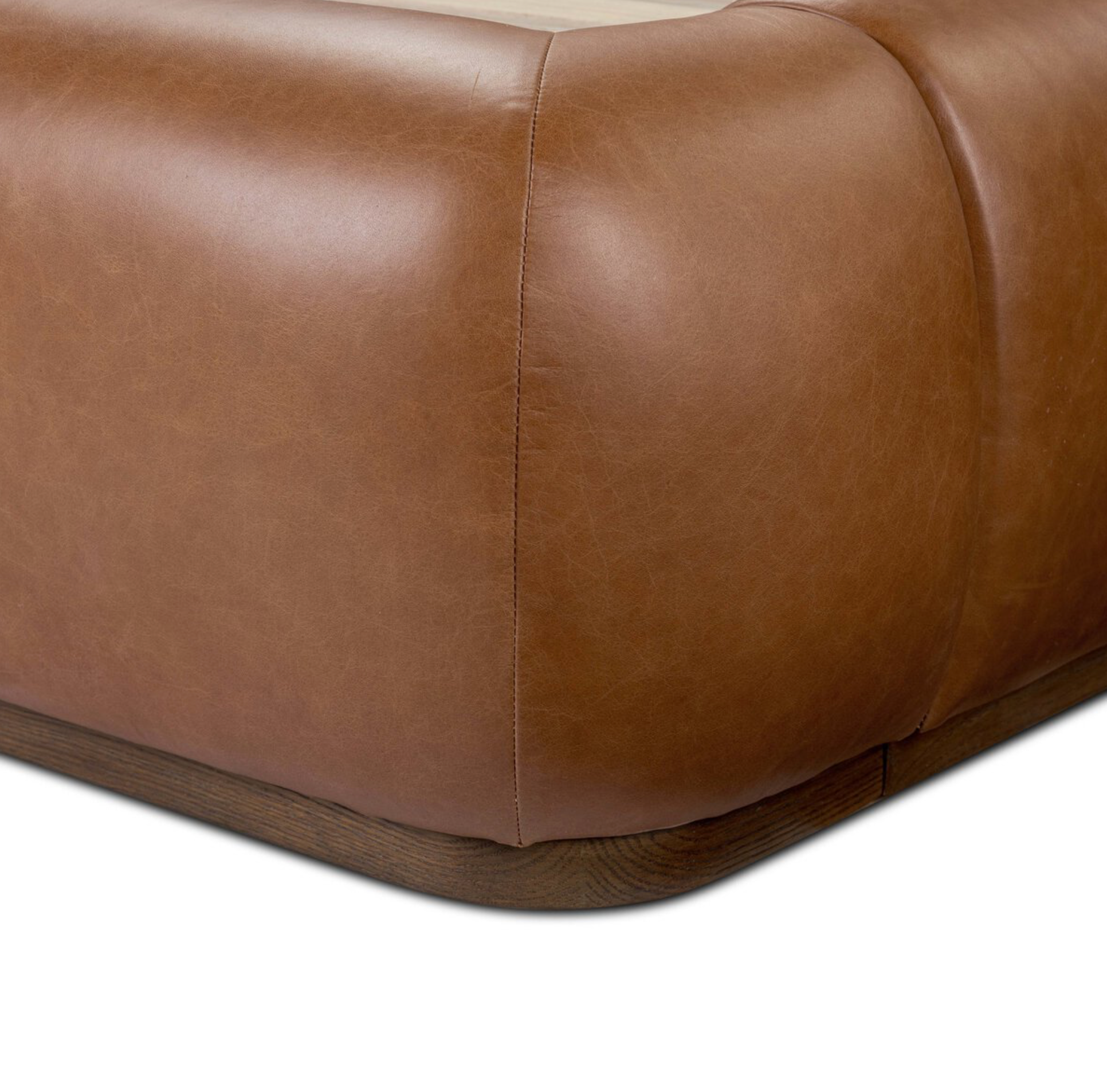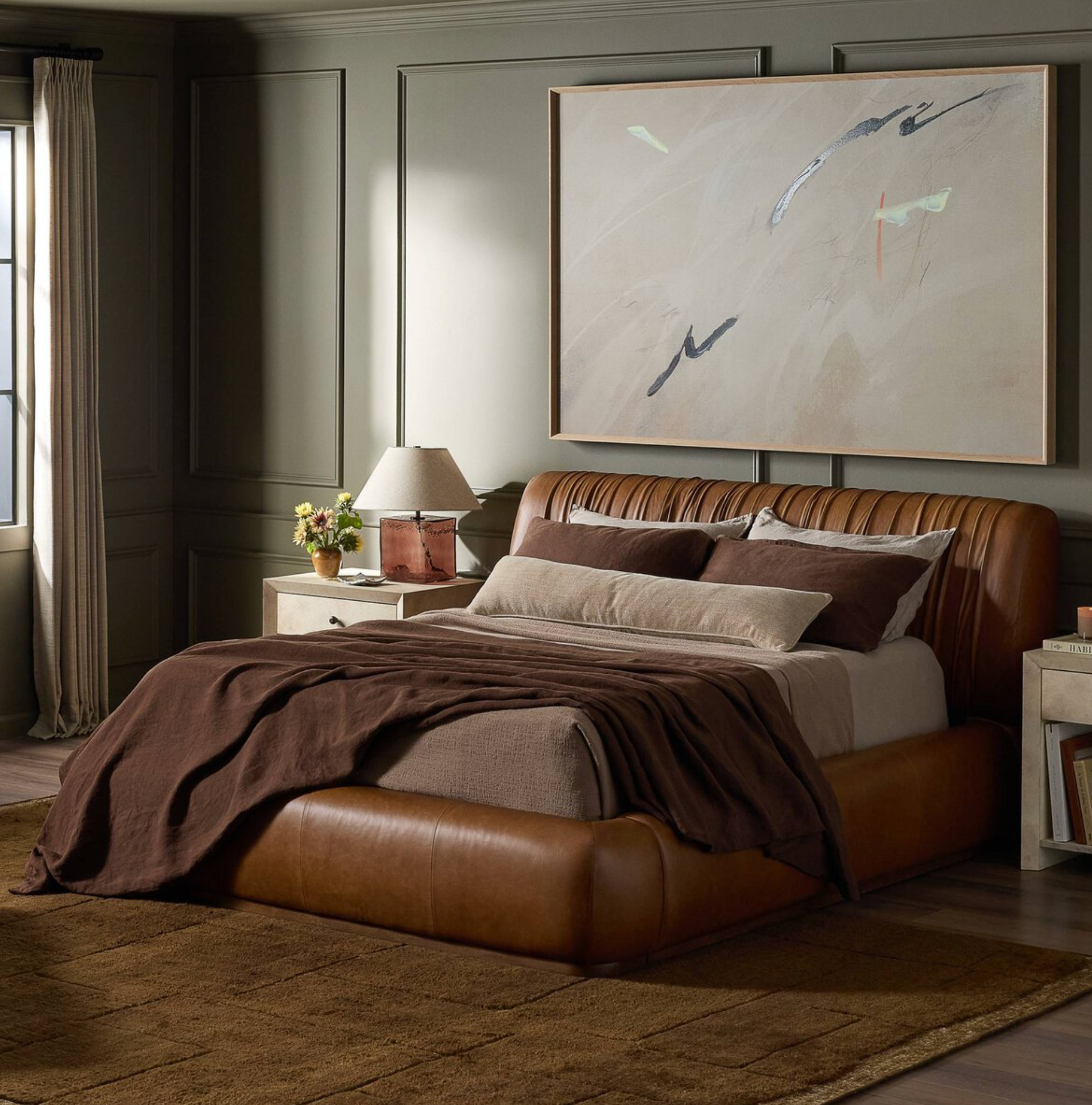 Bring vintage vibes to the bedroom. A sleek, low silhouette is covered in chestnut top-grain leather. A meticulously ruched headboard reflects the Seventies inspiration behind this versatile piece.
