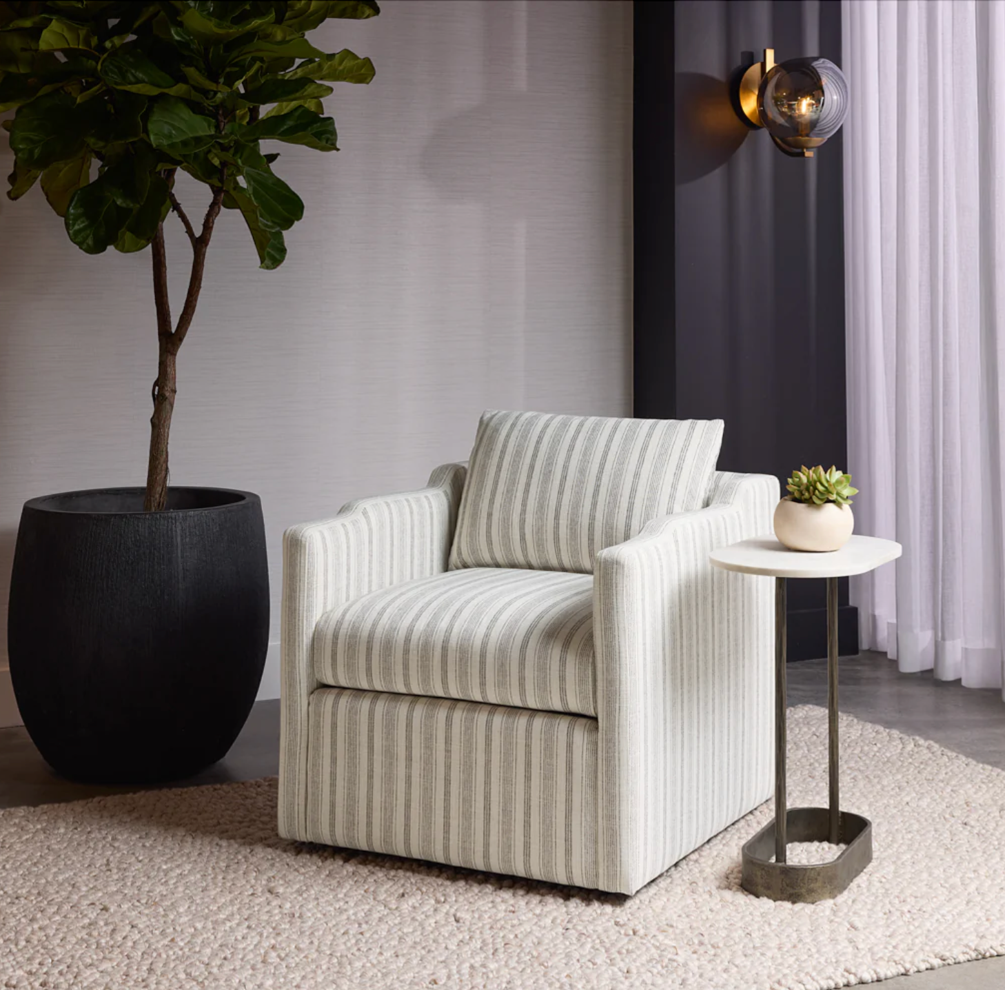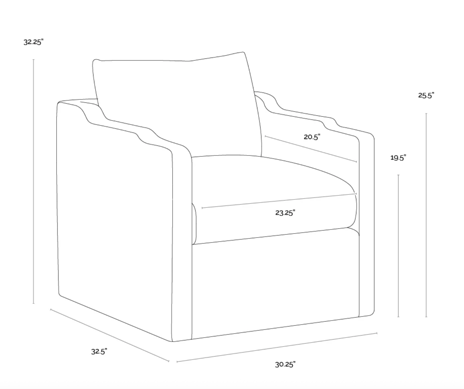 A sleek take on contemporary techniques, the Roxton Swivel Lounge Chair is a clean and minimal elevation of beach house design. Upholstered in gifford script linen-blend fabric, and with a polyurethane foam and feather-fill back and seat, this armchair is as handsome as it is comfortable.