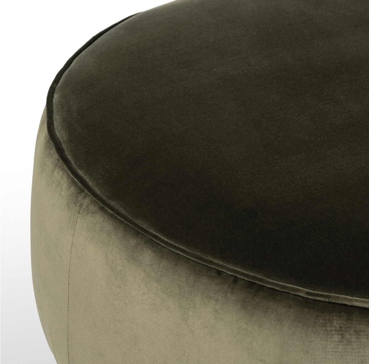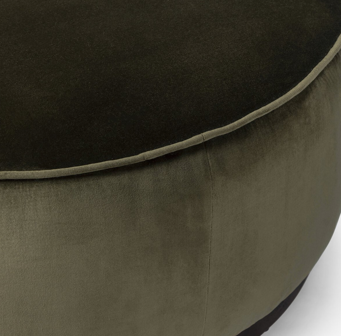 Upholstered in a deep olive velvet and paired with a rich brown base, this wide, round ottoman can be placed just about anywhere – bringing with it a luxe vibe. Style with a tray as a design-forward coffee table.