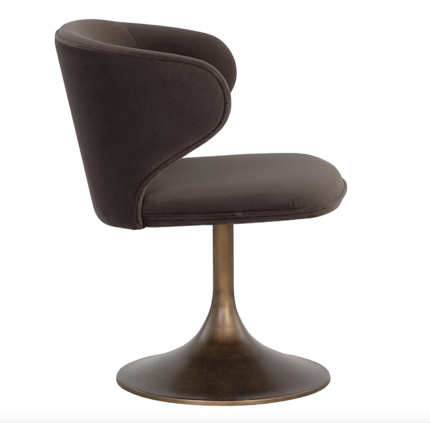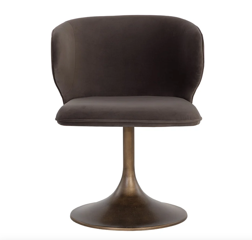 Create a captivating dining space with this eye-catching swivel dining chair that has a contemporary flair. Stocked in ash fabric and completed with a round, antique brass stainless steel base.