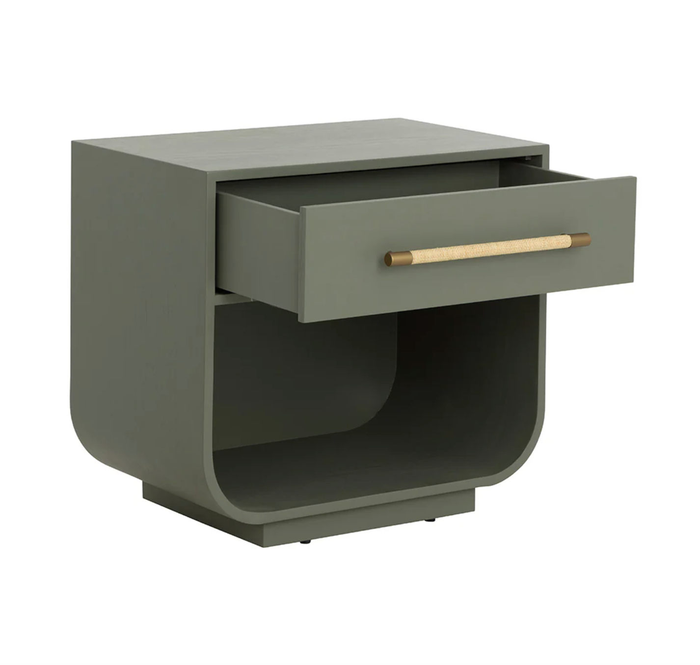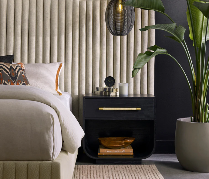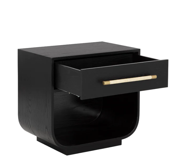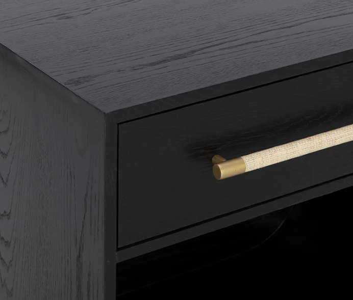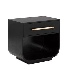 Fluid lines and gentle curves make up the modern silhouette of the Taran Nightstand. The raffia wrapped drawer handle adds an understated touch to the black oak veneer base.