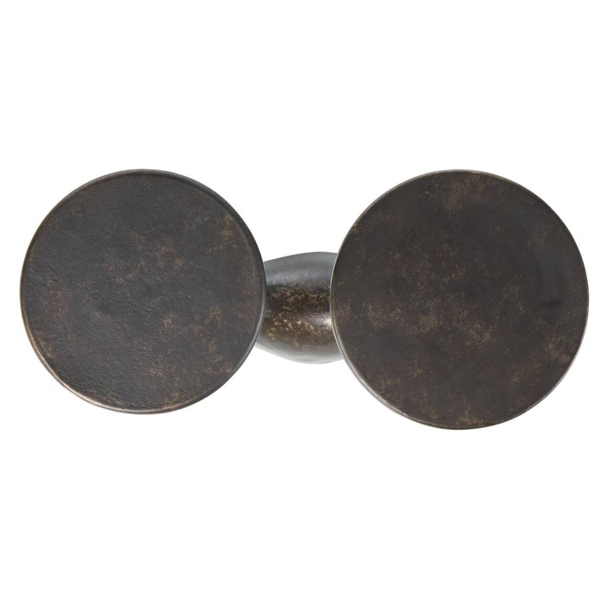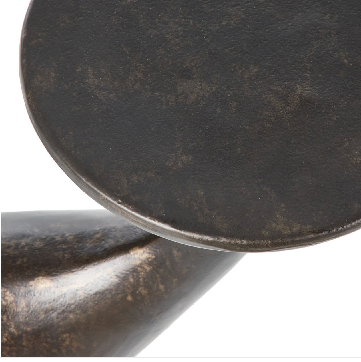 Made from distressed metal with a bronzed finish, an organically shaped end table features two tabletops, perfectly sized for your drink or favorite book.
