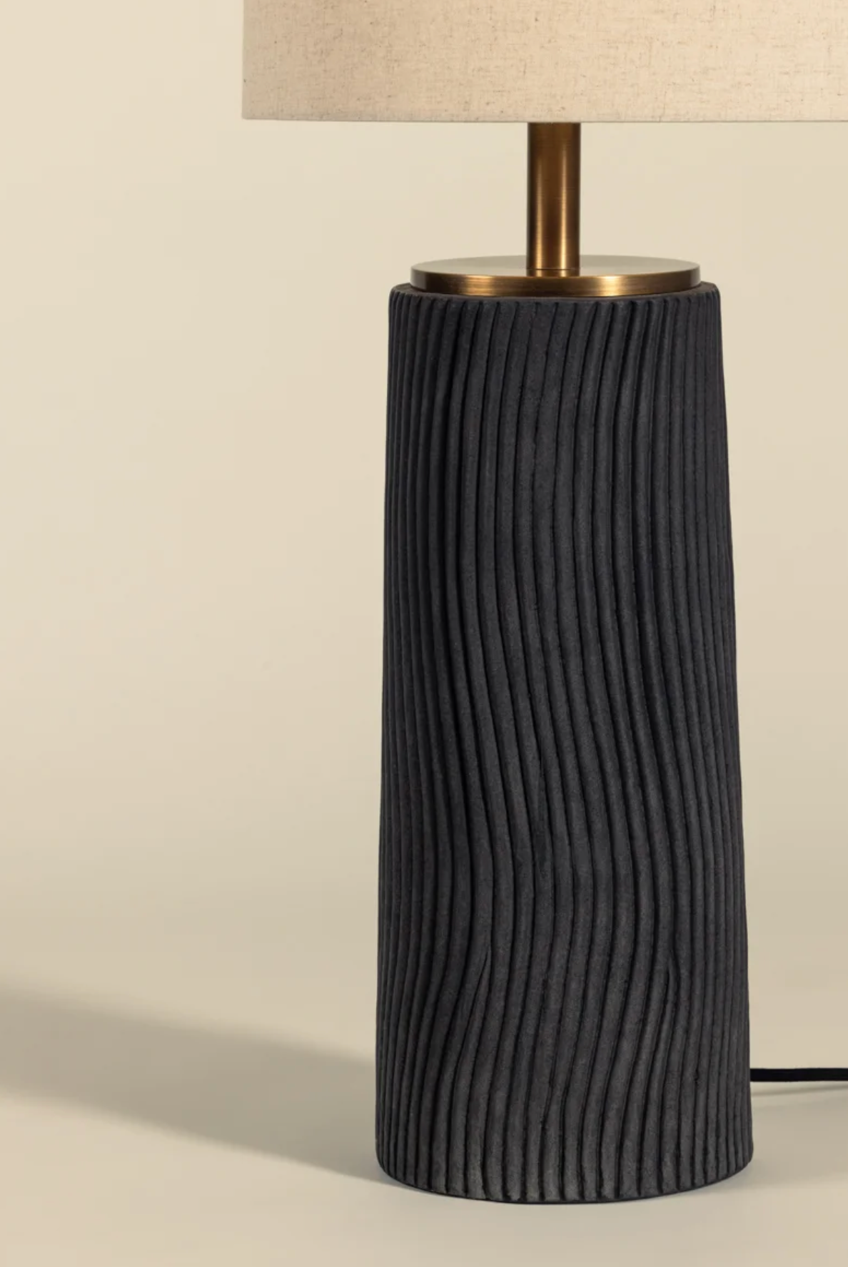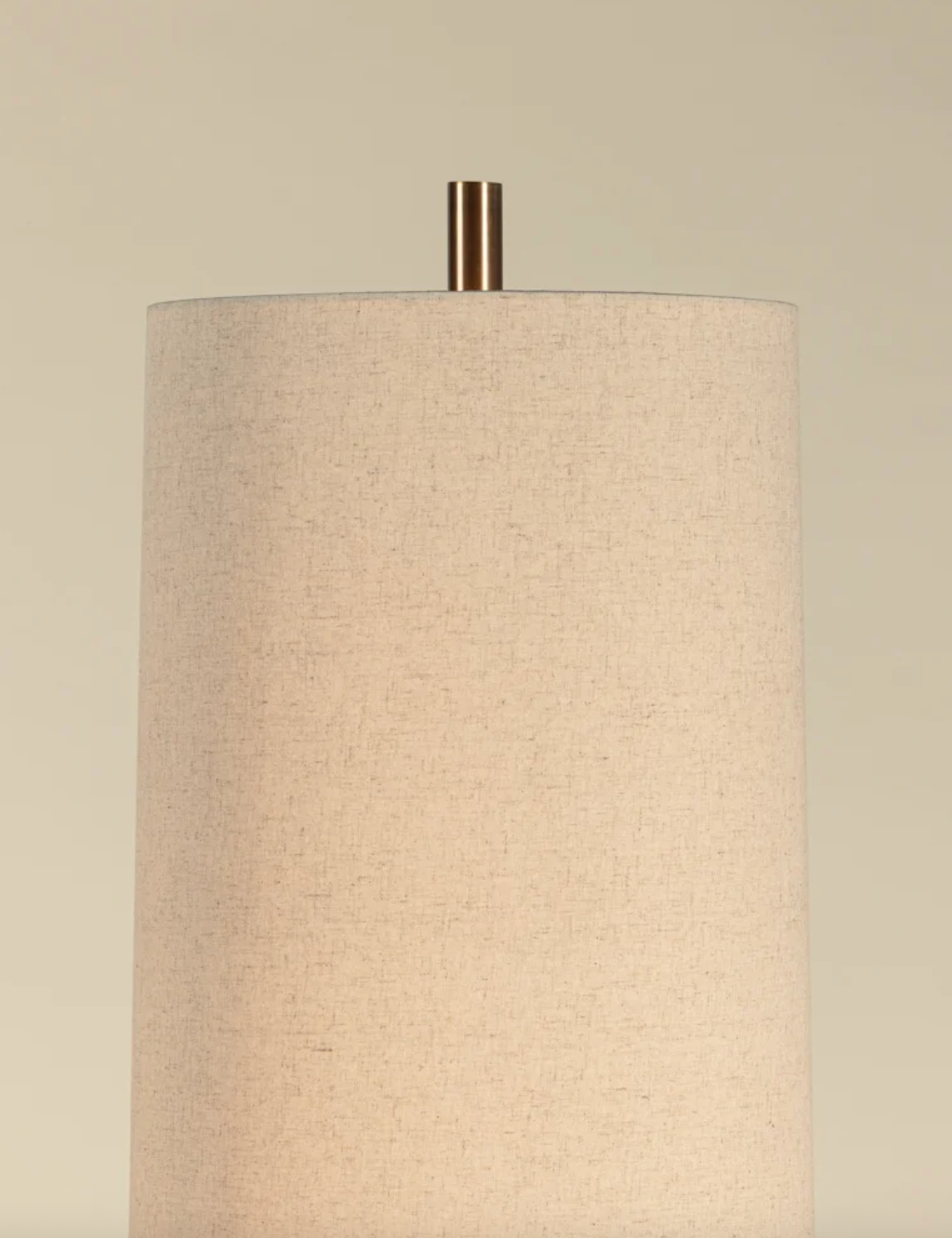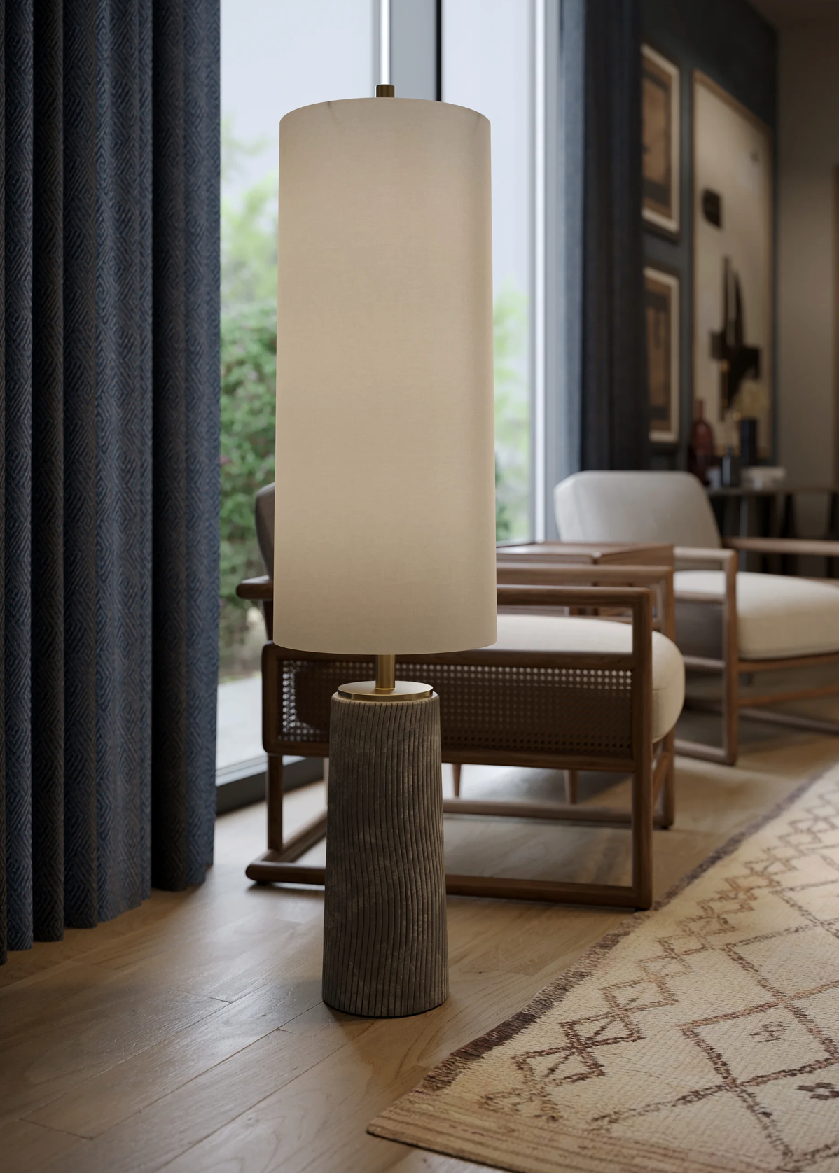 A new archetype in the floor lamp category, Thayer features a friendly scale suitable for placement in many rooms. This 'community lamp' features an elongated shade made from natural linen and a low profile, tapered ceramic base finished in a grey glaze. An organic raked pattern reminiscent of the sand lines in a Japanese zen garden has been etched into the surface. Patina Brass accents add a metallic touch at the neck and finial, creating a connection between the elements.