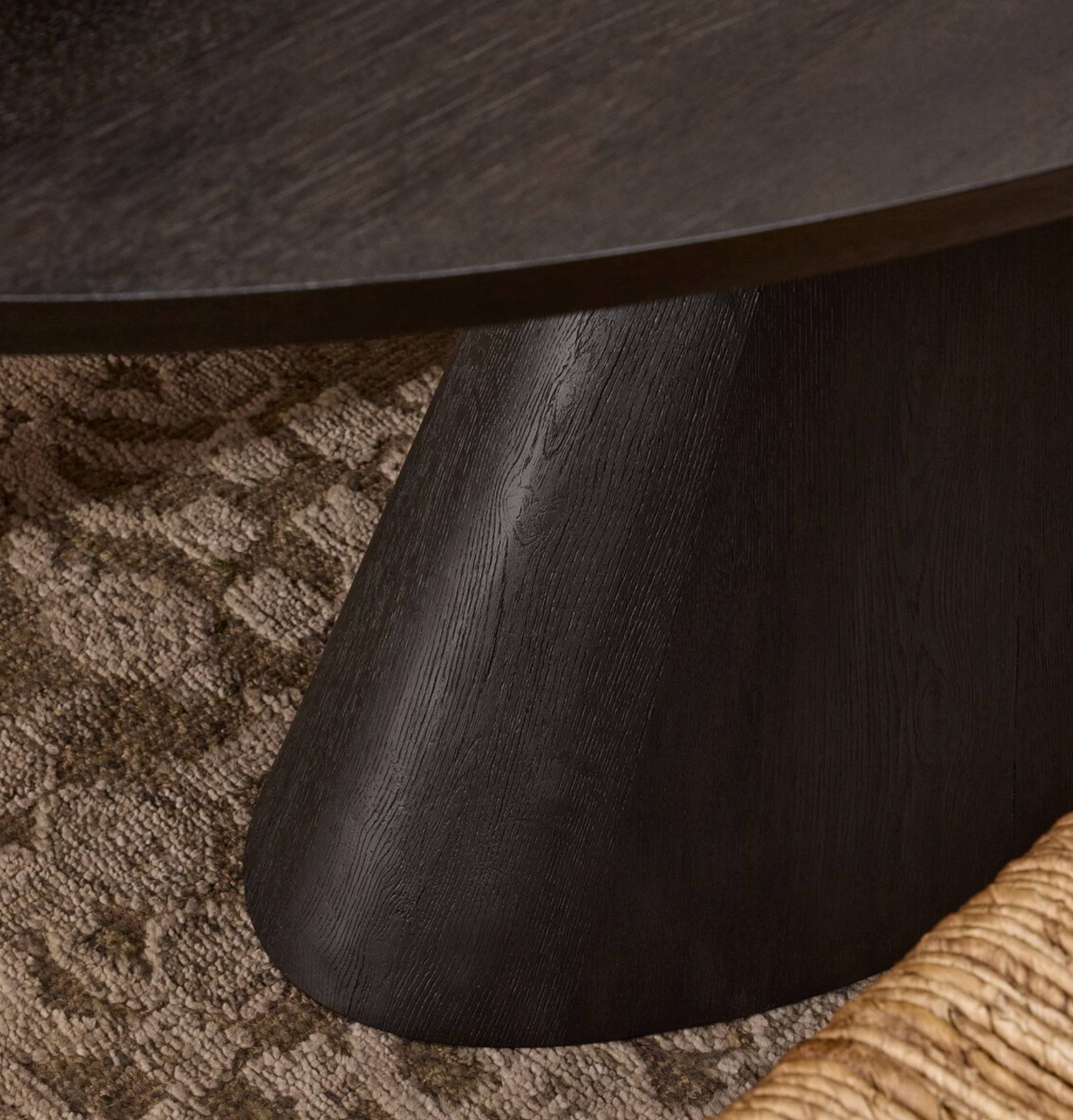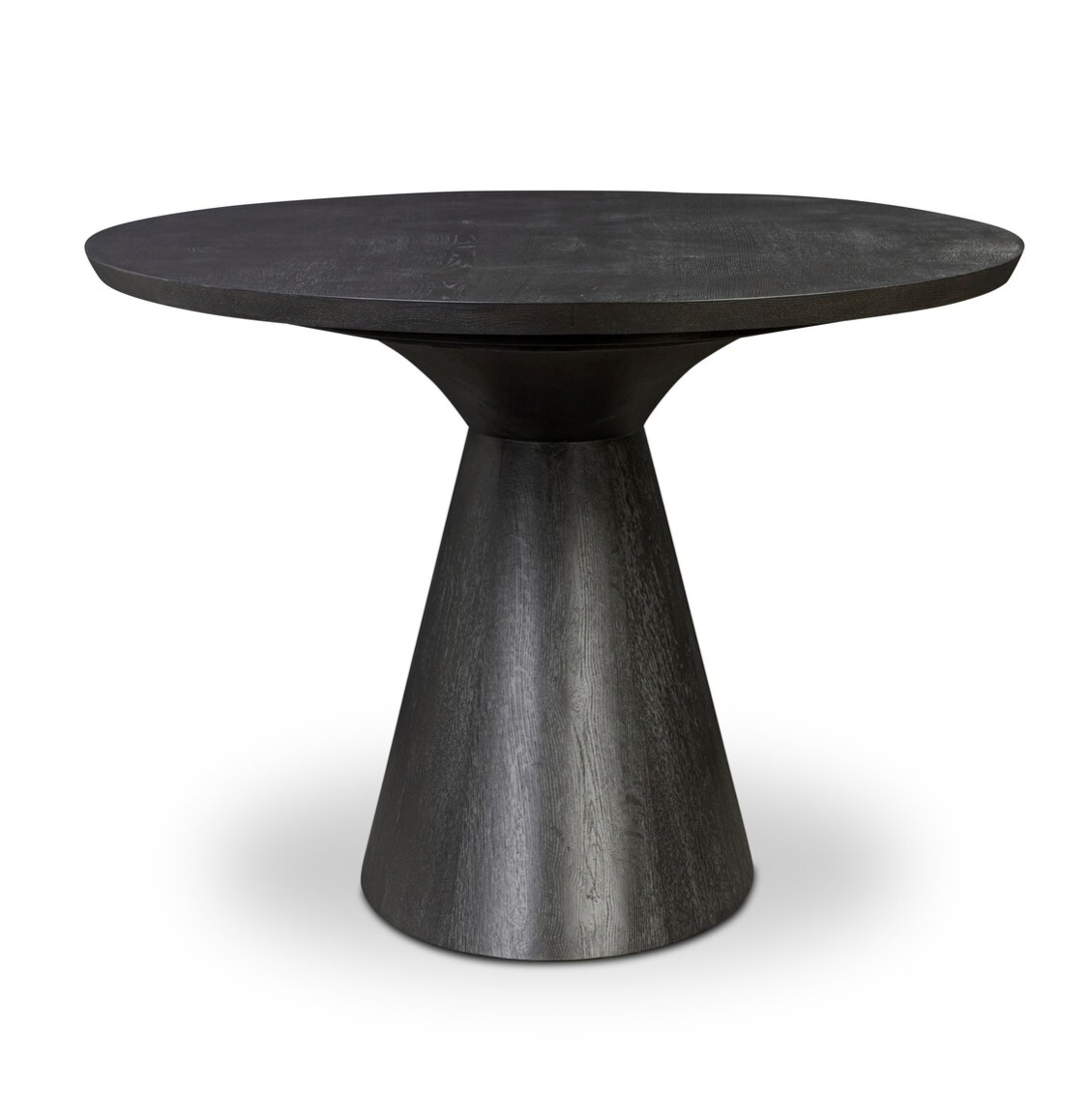 Gather around a sculptural art form. With a tapered oval top and base in an exaggerated cinch, this black table adds bold, dramatic presence to modern dining areas.